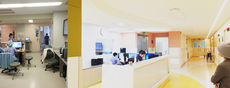 진통실마다 컬러테라피가 될 수 있도록 색감에 의미를 부여했다. 다양하고 풍부한 색감은 아무래도 불안과 고통에 시달리는 산모에게 안정감과 편안함을 가져다준다. 공간이 사람에게 배려하는 디자인이다. 그리고 복도도 손을 봤다. 일자형 스테이션은 업무 효율을 위해 그대로 두되, 천장과 바닥에 곡선을 연출했다. 시각적인 착시효과로 부드럽고 넓게 공간을 느끼게 한 것이다.