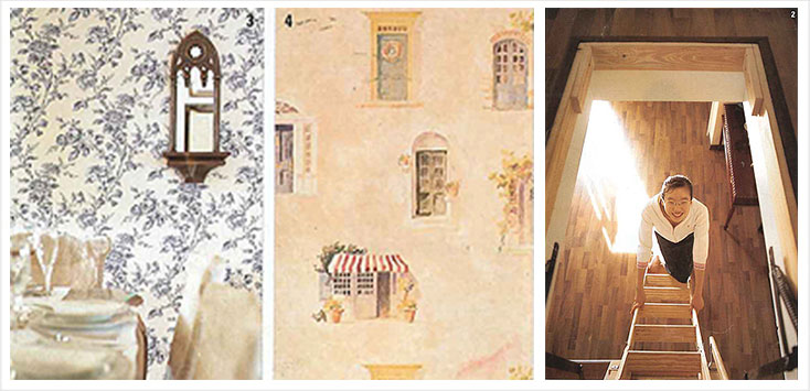 이 집을 구경하는 시각적인 재미가 느껴진다면 과감하고 다양한 벽지를 사용하고 있는 것을 그 이유로 꼽을 수 있다. 대지 면적 80평, 1층 건평 43평, 2층은 20평. 그런데 이 집을 구경하다 보면 실제 면적보다 훨씬 넓어 보인다. 그것 역시 다채로운 벽의 변화에서 비롯된다. 거실에서 주방으로, 계단에서 아이들 방이 있는 2층으로 이어지는 동선 중에 꽤 많은 벽지 패턴을 발견할 수 있다. 거실은 편안하면서 고급스러움이 돋보이고, 계단실은 부드러운 색감이면서도 강한 선이 돋보이는 패턴이다. 천장 아래 가족사진을 전시해둔 벽면은 파란 하늘빛을 닮았다. 세화 방은 사춘기 소녀 아이 방답게 보랏빛 꽃물결이고 준엽이 방은 장난기 가득한 동화 그림이다.