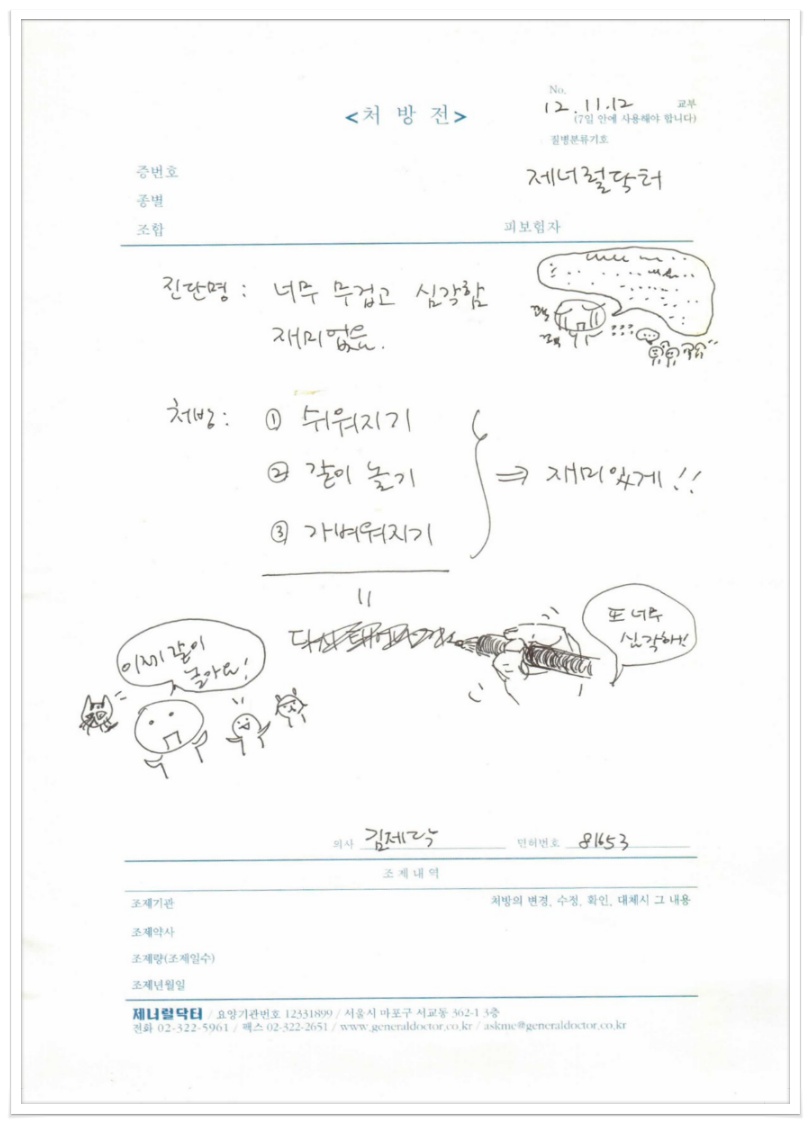 병원인가 카페인가로 이슈가 되었던 제너럴 닥터의 홈페이지를 열면 화면 가득 사진과 같은 처방전이 뜬다. 늘 차갑게 느껴지는 병원 분위기와 어디가 아픈지 말 붙이기에도 미안하던 의사의 모습, 그리고 왠지 모르게 갑갑한 병원 특유의 냄새, 기억 속의 병원은 조금 아파도 웬만하면 경험하고 싶지 않은 공간이다. 그런데 친구 같은 의사가 여유롭게 반겨주고 따뜻한 느낌과 기분 좋은 커피 향 가득한 병원이 있다면 어떨까? 조금 낯선 이야기처럼 느껴지겠지만 국내에도 새로운 의료 경험을 제공하는 병원과 의사가 있다. 바로 제너럴 닥터 김승범, 정헤진 선생님이다. (UX 디자인 /에이콘 2011, 본문 51p)