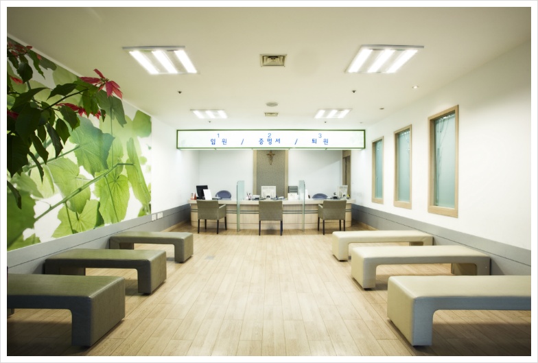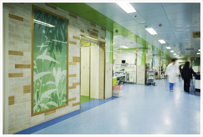 색채학자 괴테와 쾨스틀린은 녹색(그린)이 주는 느낌은 조화롭고 균형을 주는 효과가 있다고 하였으며, “녹색(그린)은 우리를 단순히 고요하게 하며 긍정적으로 마음을 진정시키는 부드러운 충만을 지닌 채 우리의 눈에 들어오기 때문에 그린보다 편안하게 해주는 색은 없다”라고 하였다. 많은 사람이 찾는 기능검사실, 휴게실은 사람이 상당한 피로감과 검사에 대한 불안감을 줄 수 있음으로 그린색으로 공간을 인테리어 함으로서 보다 나은 진료와 치료 효과를 동반 할 수 있는 것이다.