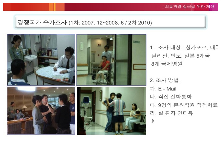 우리는 담당자를 통해 약 한 시간 동안 병원의 소개와 지금껏 이 병원의 설립부터 현재 행하고 있는 의료서비스와 의료관광에 대한 내용을 들었다. 듣고 나니 이렇게 입지적으로 한적한 병원이 병상이 꽉 찰 정도로 운영되고 있을 만한 이유를 알기에 충분했다. 추상적인 리서치가 아닌 실제 사례조사와 경쟁이 될 만한 곳에 정확한 사례조사의 데이터를 통해 구체적으로 검진 항목 대상 마다 마다하는 가격을 비교 조사하였고 그것을 나라별 상품개발을 하는 것에 많은 시간을 투자하였다고 전했다. 실질적으로 대상자들이 보기 쉽도록 중국인이라면 그 환자들에게 우리보다 앞선 서비스와 우리나라에서 행하면 좋은 서비스를 나눠서 설명하는 자료를 만들고 일본인들에게도 마찬가지로 그런 방법으로 환자들이 자료를 손쉽게 보고 알아볼 수 있게 그리고 스스로 판단하여 찾아올 수 있도록 하였다.