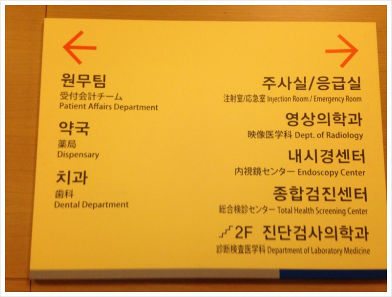 로비에서의 화려하고 웅장했던 분위기와는 달리 병실과 진찰실들의 분위기는 다소 소박했지만, 환자들의 배려를 위한 여러 가지 세심한 노력의 손길이 곳곳에 넘치고 있었다. 병원의 환자들이 거의 외국인이라는 것을 고려하여 모든 사인에 영어와 일어 중국어의 표기를 해 놓은 것이 인상적이었는데 디자인 측면으로 보기엔 조금 어수선해 보이겠지만 ? 위해선 친절한 4개 국어 표시로 환자들이 잘 찾을 수 있도록 하였다.