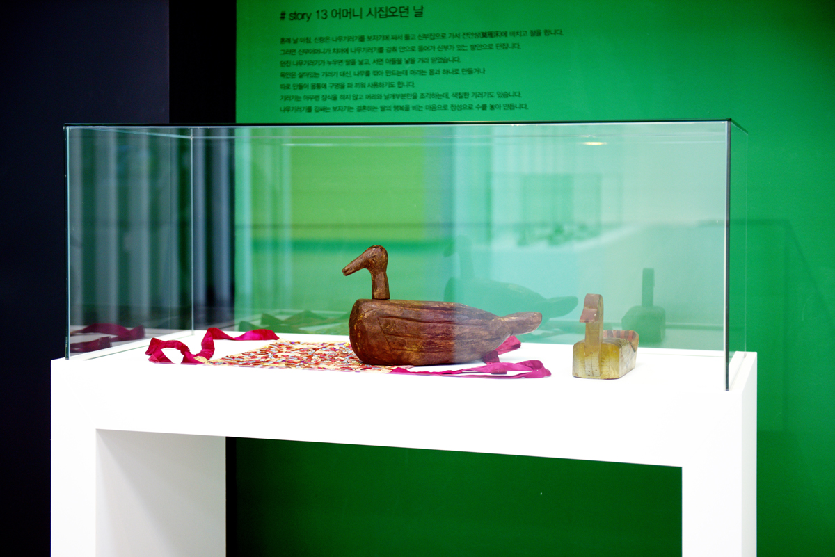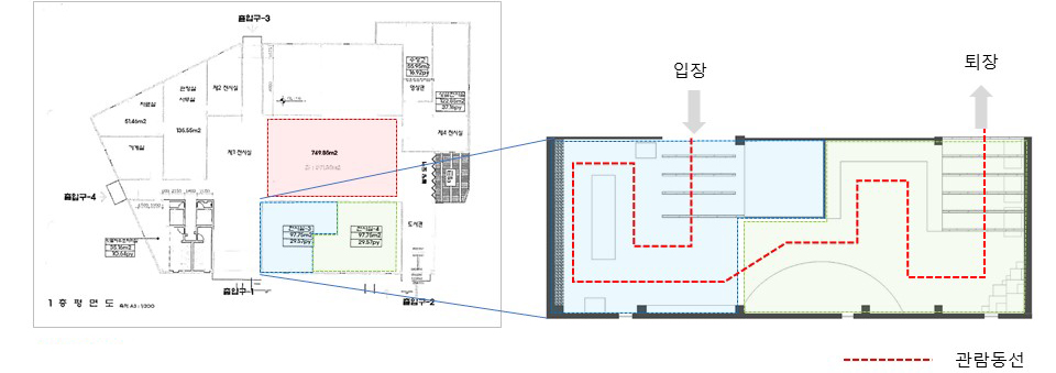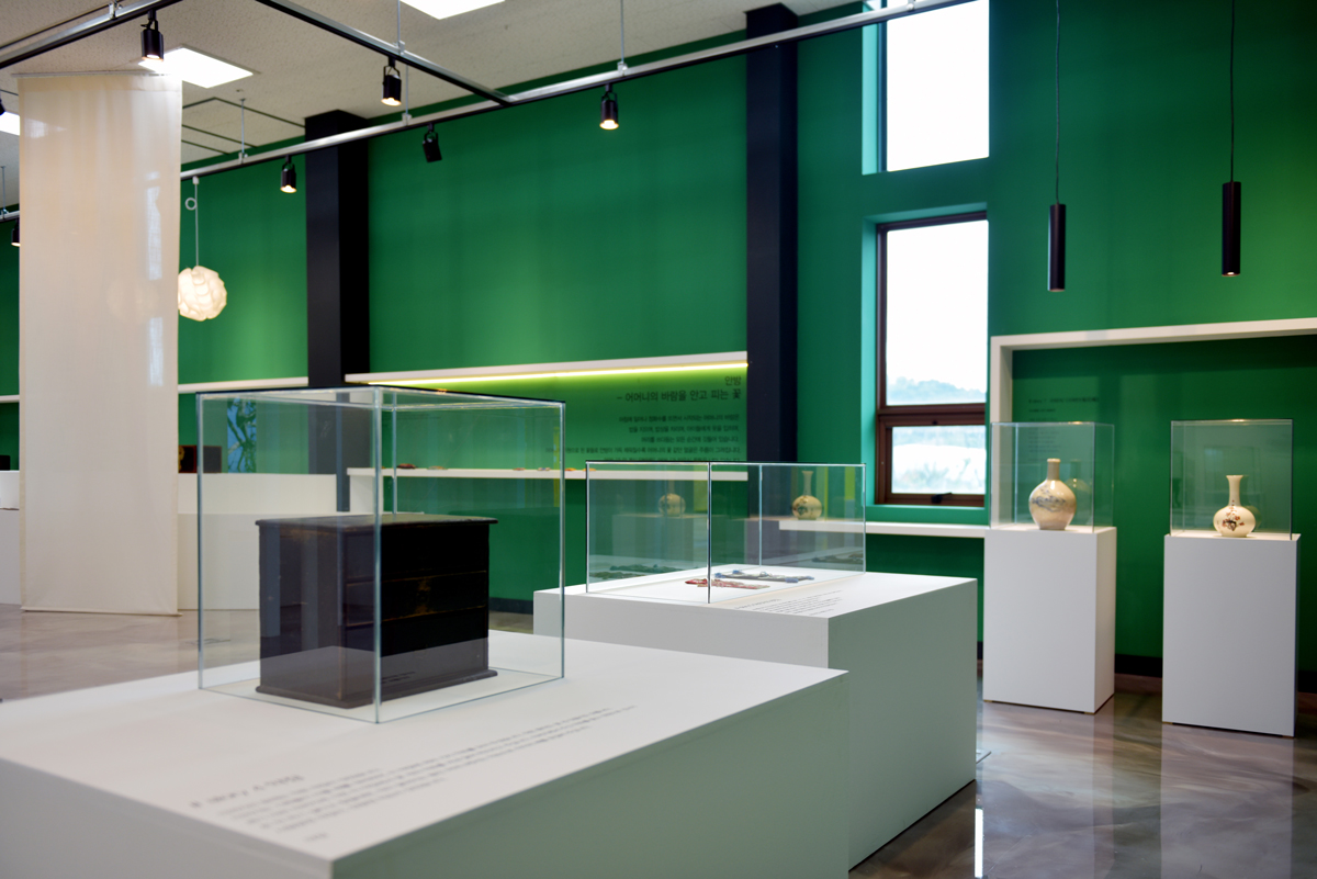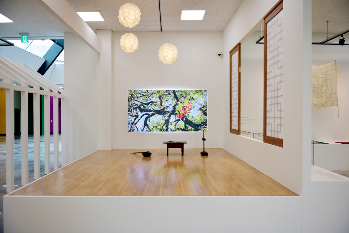 제1전시실은 입구부터 독특하다. 박공지붕을 연상시키는 구조물은 마치 집 안으로 들어오는 듯한 느낌을 안겨준다. 이곳은 우리나라 전통의 안채와 사랑채를 모티브로 설계한 만큼 집 모양의 연출이 탁월했다. 장천꽃박물관 학예사는 “내 방 안에서 편안하게 꽃을 감상하도록 전체 집처럼 꾸몄다”라고 설명했다. 노태린 대표는 이를 토대로 제1전시장 안에 하나의 방처럼 터를 만들고 그 옆에 한옥의 창을 연출했다. 더욱이 벽면에 백라이트로 꽃을 시각화한 점이 돋보인다. 이곳은 현재 <마음 하나 꽃 한 송이>라는 이름의 전시가 진행 중이다. 장천꽃박물관은 1년에 한 번 ‘꽃 박물관에 책 1권’을 기획하고 있다고 전했다. 전체 짙은 그린 컬러를 입힌 공간은 마치 자연 속에서 꽃을 감상하듯 편안하고 싱그럽게 조성되었다. 김이랑 작가의 글과 꽃 그림이 곳곳에 펼쳐져 공간을 풍요롭게 이끌고 있다. 특히 사계절에 피는 46가지의 꽃이 생화와 함께 연출된 점 역시 무척 인상 깊다.