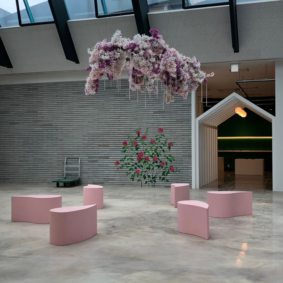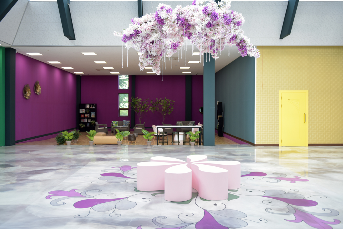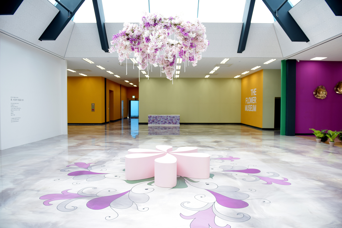 장천꽃박물관은 컬러와 빛이 조화를 이룬 공간으로 새롭게 탄생했다. 기존의 유리 패널로 마감된 중앙 홀 천장은 외부의 빛을 강하게 받아들였다. 이로 인해 광택이 나는 에폭시 바닥 마감에 반사광이 조성되어 실내 분위기를 화사하게 물들였다. 또한 천정에 적용된 뼈대와 같은 구조물은 지붕처럼 연출되어 내부를 투영하듯 바라보고 있다. 이곳에 설치된 꽃구름(2020, 노태린) 작품은 공중에 매달린 채 꽃잎이 흩트려진 바닥 패턴과 조화를 이루며 마치 꽃 속에 앉아 휴식하는 느낌을 안겨준다.