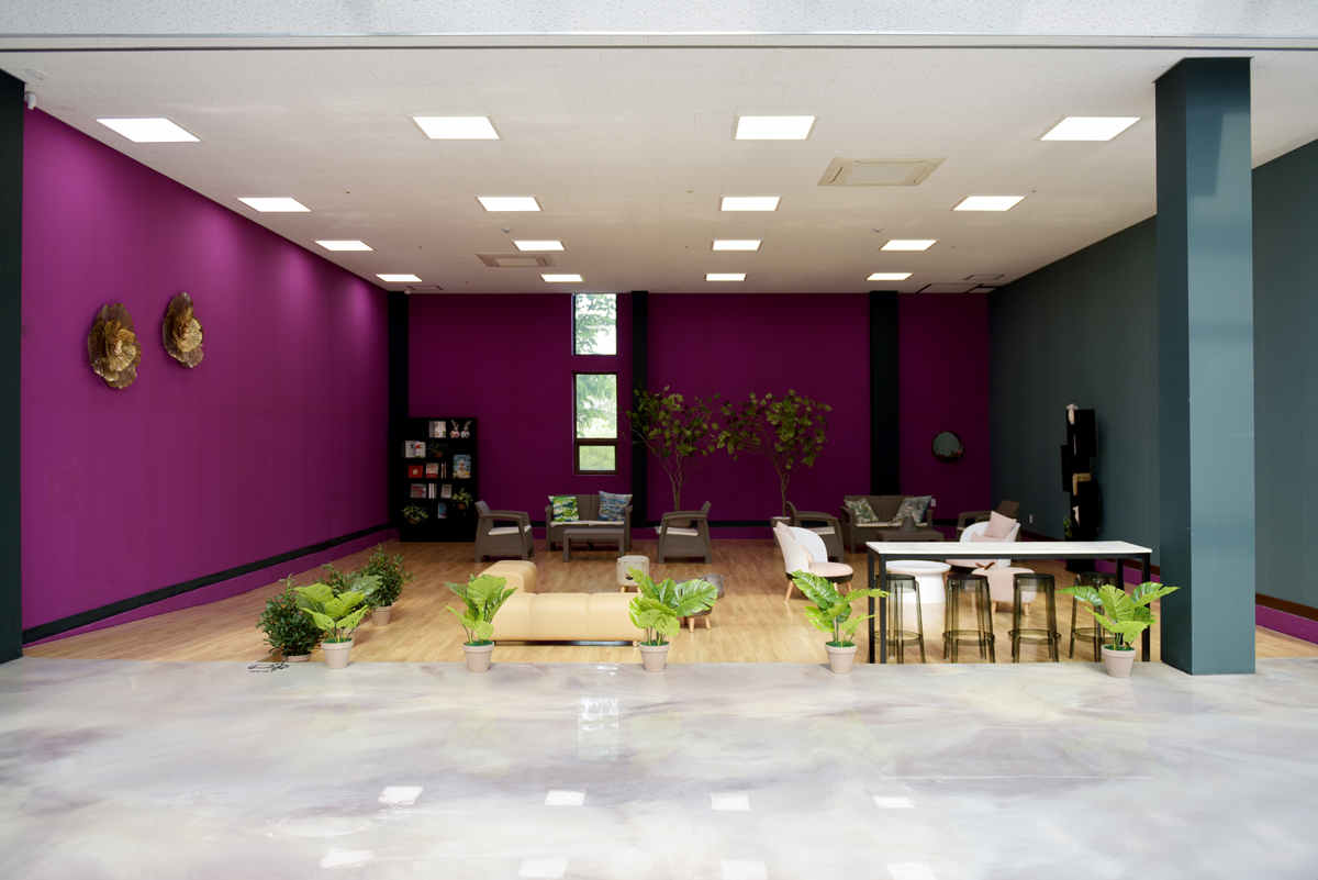 홀 중앙 왼편에는 강렬한 바이올렛 컬러가 돋보인 화사한 공간이 펼쳐져 있다. 이곳은 관람객들의 휴식을 위한 카페 공간으로 아기자기한 의자와 스툴, 라탄 가구, 동물 체어가 눈에 띈다. 특히 곳곳에는 다양한 식물 화분을 설치해 공간을 자연 친화적으로 물들였다. 바이올렛 컬러 벽면에는 꽃 코르사주로 포인트를 주어 하나의 오브제로서 공간을 세련되게 이끌고 있다. 천정은 라탄 소재의 디자인 조명으로 아늑한 분위기가 조성되었다.