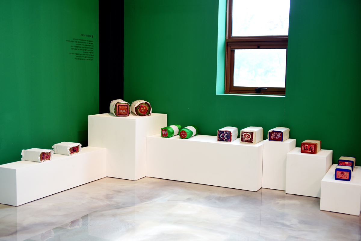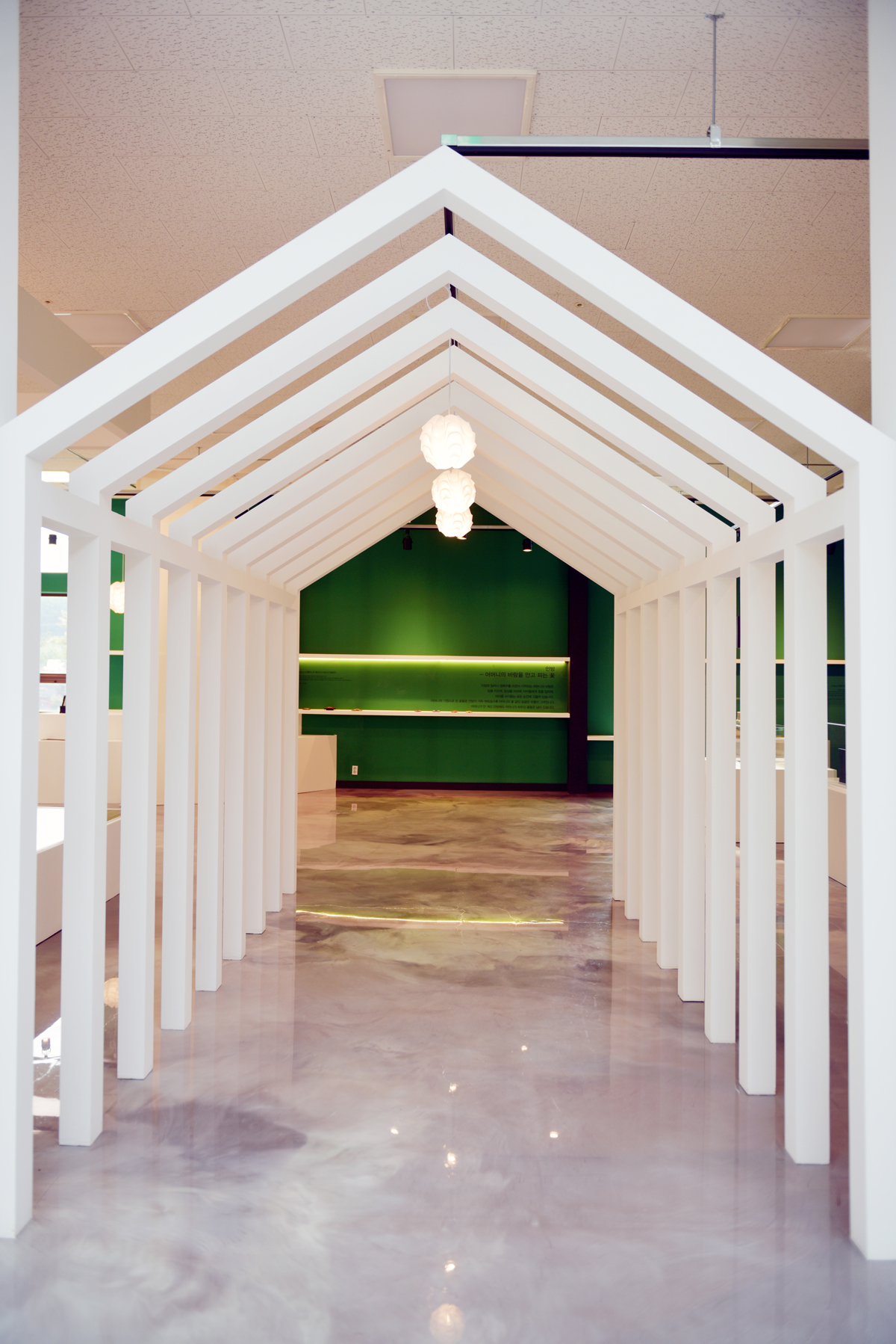 제1전시실은 입구부터 독특하다. 박공지붕을 연상시키는 구조물은 마치 집 안으로 들어오는 듯한 느낌을 안겨준다. 이곳은 우리나라 전통의 안채와 사랑채를 모티브로 설계한 만큼 집 모양의 연출이 탁월했다. 장천꽃박물관 학예사는 “내 방 안에서 편안하게 꽃을 감상하도록 전체 집처럼 꾸몄다”라고 설명했다. 노태린 대표는 이를 토대로 제1전시장 안에 하나의 방처럼 터를 만들고 그 옆에 한옥의 창을 연출했다. 더욱이 벽면에 백라이트로 꽃을 시각화한 점이 돋보인다. 이곳은 현재 <마음 하나 꽃 한 송이>라는 이름의 전시가 진행 중이다. 장천꽃박물관은 1년에 한 번 ‘꽃 박물관에 책 1권’을 기획하고 있다고 전했다. 전체 짙은 그린 컬러를 입힌 공간은 마치 자연 속에서 꽃을 감상하듯 편안하고 싱그럽게 조성되었다. 김이랑 작가의 글과 꽃 그림이 곳곳에 펼쳐져 공간을 풍요롭게 이끌고 있다. 특히 사계절에 피는 46가지의 꽃이 생화와 함께 연출된 점 역시 무척 인상 깊다.