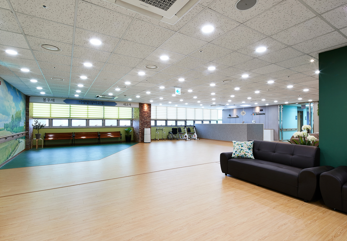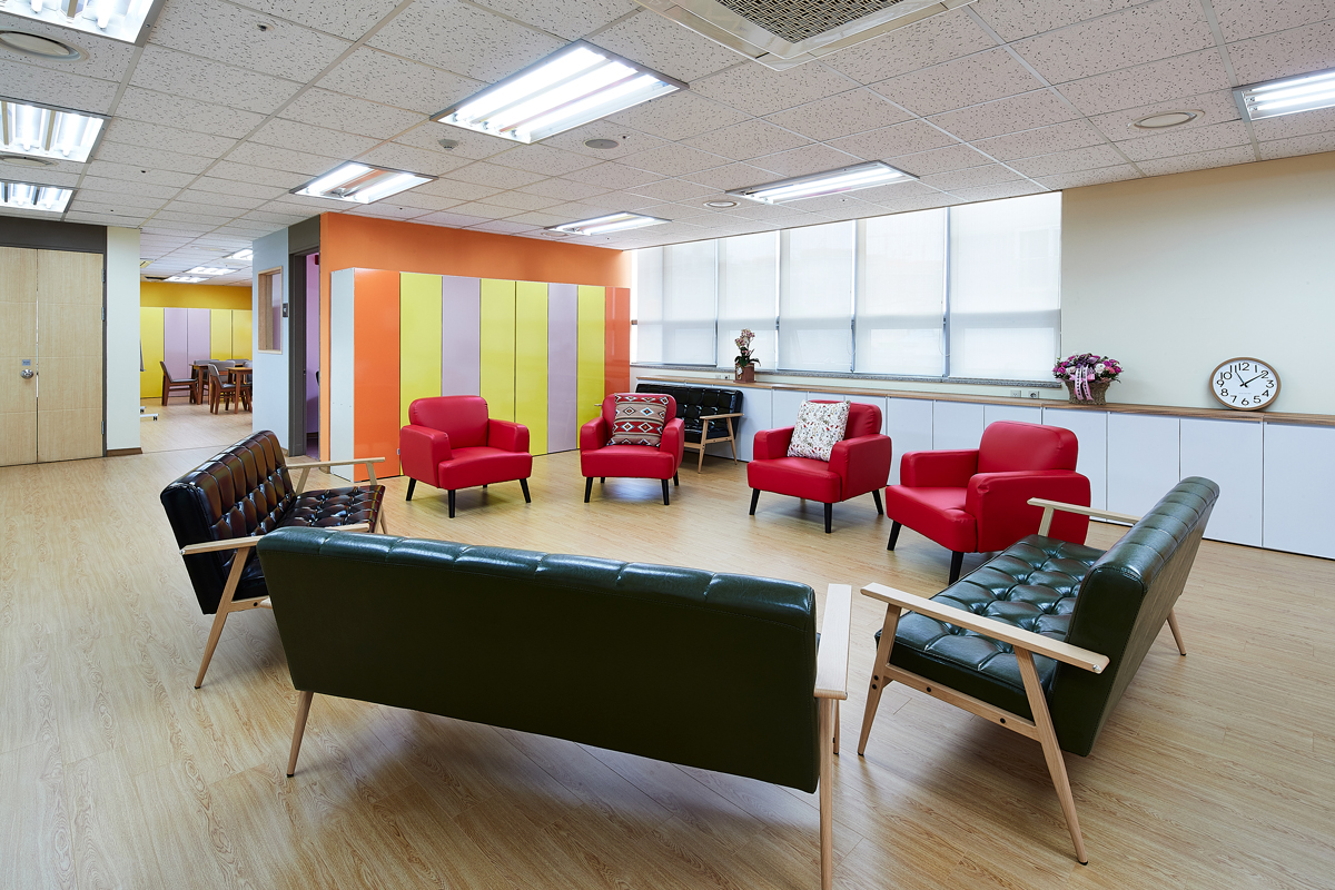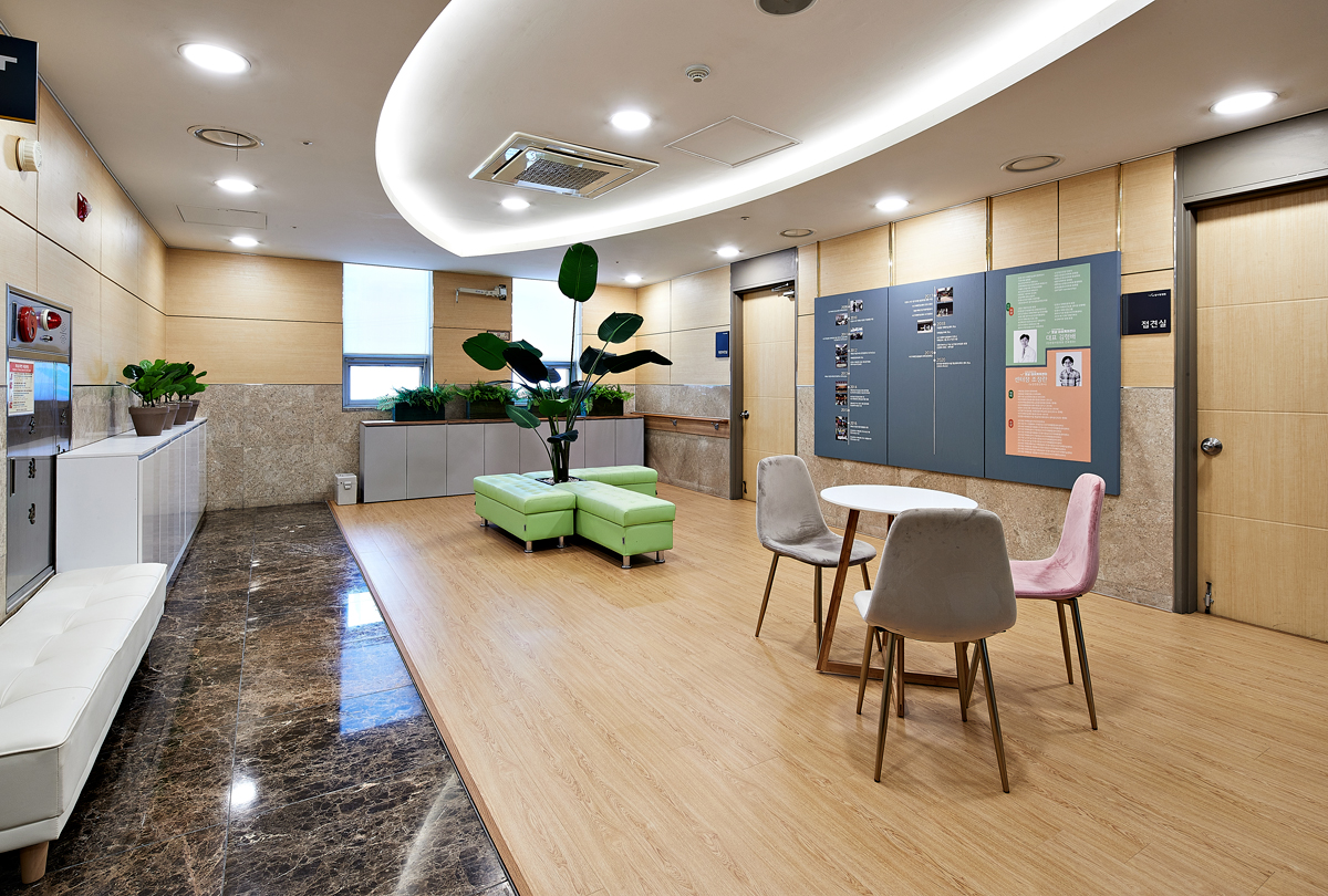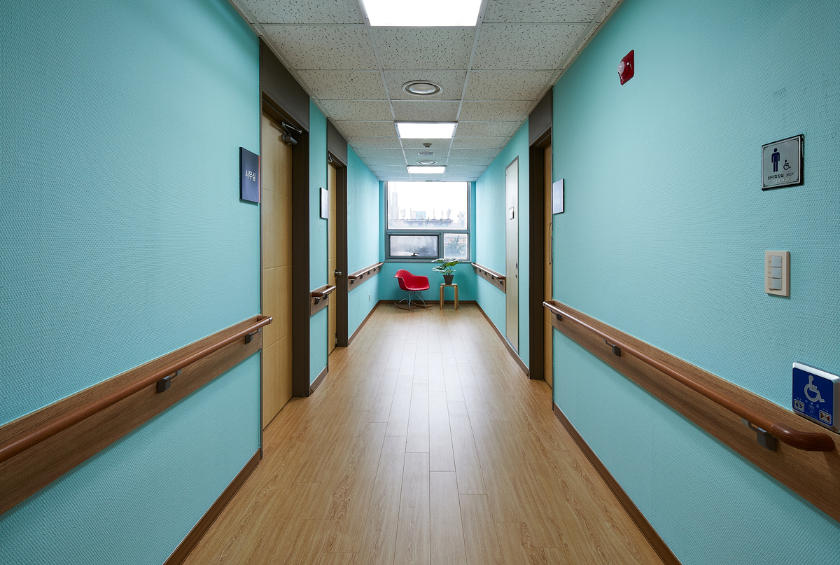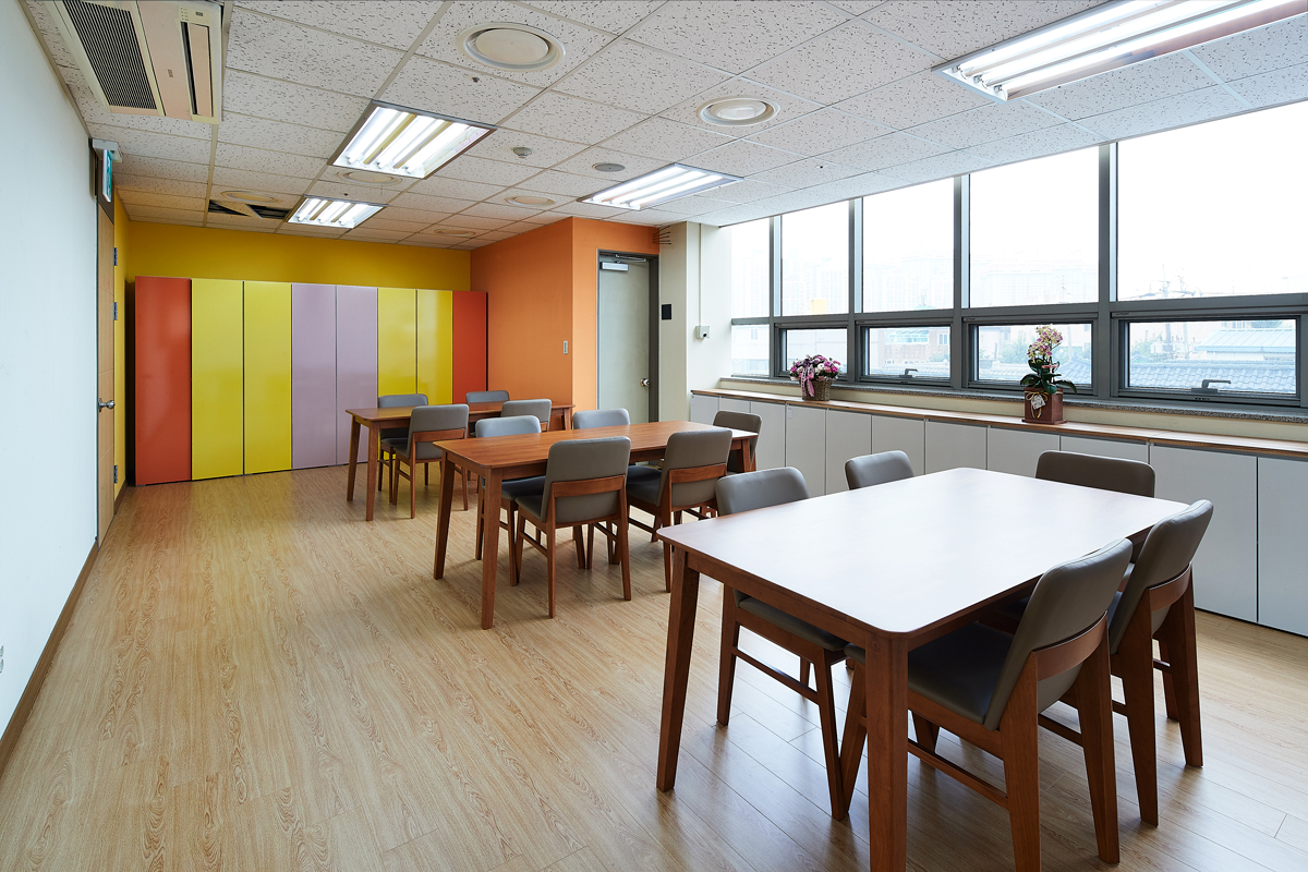 사랑 마당 공간의 경우 치매 노인들이 모여 담소를 나누는 만큼 따뜻한 계열의 오렌지 컬러가 벽면을 장식했다. 또한 레드와 블랙 컬러의 의자 배치로 공간에 신선한 에너지와 활력을 불어넣었다. 뒤편 수납장은 옅은 그린과 오렌지, 바이올렛 톤으로 차분함과 활기찬 에너지를 동시에 반영시킨 점이 돋보인다.