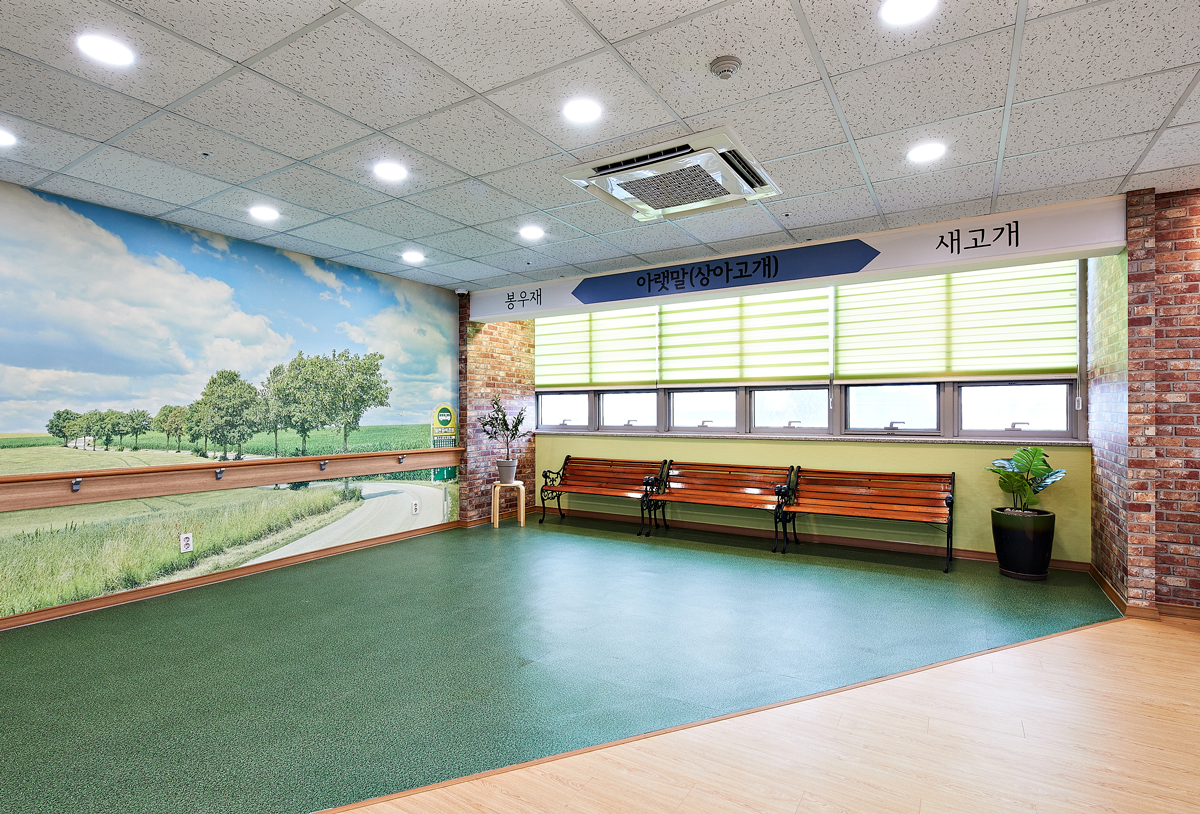내부에서 맨 먼저 눈에 띄는 곳이 바로 왼쪽에 위치한 버스 정류장이다. 상단에 마련된 버스정류장 네임과 하단에 놓인 원목 벤치가 이곳이 ‘버스가 오지 않는 버스정류장’임을 미루어 짐작게 한다. 특히 푸른 잔디밭이 프린트된 바닥과 평화로운 시골 마을길이 그려진 벽면 디자인이 안정된 분위기를 조성한다. 벽면에는 걷기 불편한 치매 노인들을 위해 안전봉이 설치되었다.
