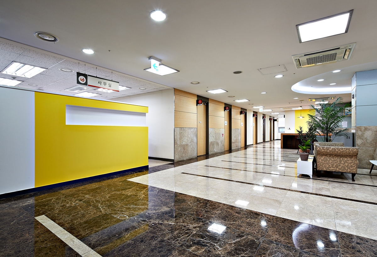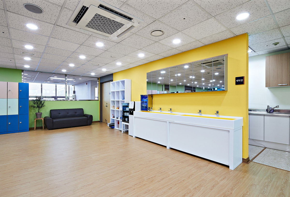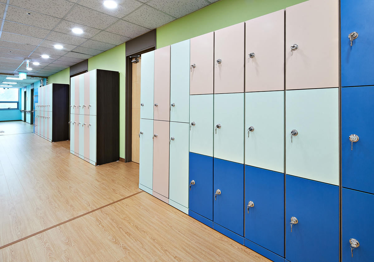 홀 뒤편에 설치된 사물함은 기분을 차분하게 이끄는 옅은 그린과 핑크, 짙은 블루톤을 선택한 점을 알 수 있다. 세면대 벽면은 밝은 옐로우 컬러로 씻는 동안 화사한 기분이 들게 했다. 또한 사무실과 화장실로 가는 복도는 파스텔 계열의 여름 하늘을 닮은 스카이 블루를 입혀 청량한 이미지를 전달했다. 더욱이 복도 끝에는 짙은 레드 컬러의 디자인 체어와 식물로 공간을 풍요롭게 가꿔주었다.