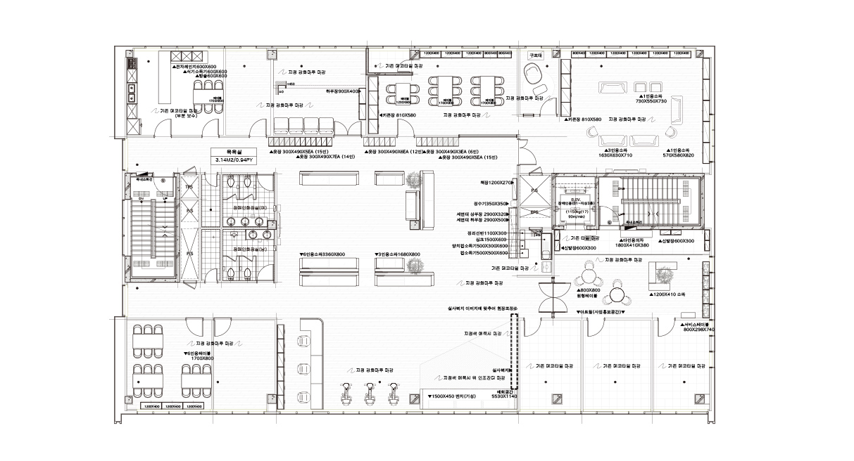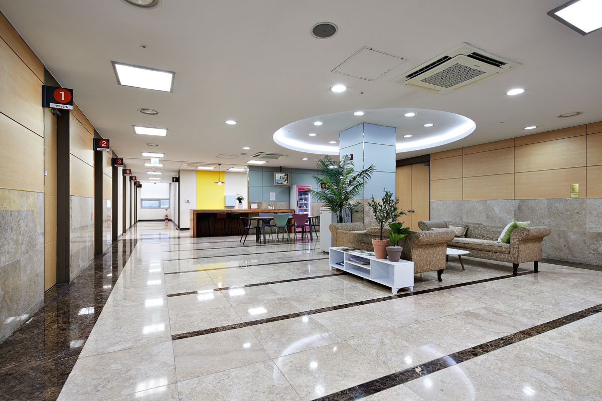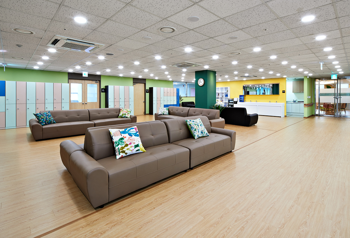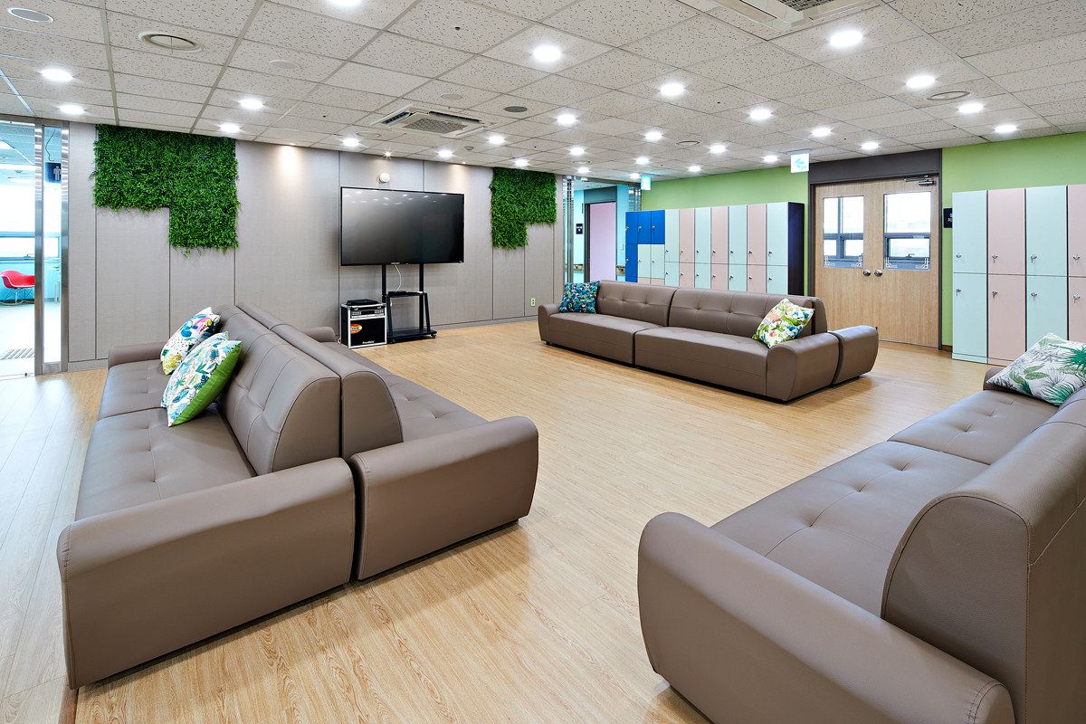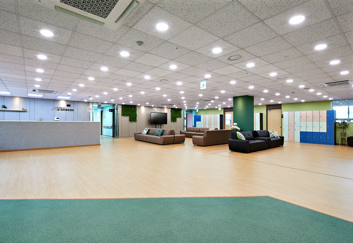 입구는 라운딩으로 디자인된 우물 천정이 전체 공간을 부드럽게 감싸 안은 듯한 이미지를 전달한다. 특히 데이케어센터의 입구인 만큼 전체 원목과 식물로 편안함을 추구하고 있는 점을 알 수 있다. 또한 소파 대신 그린 컬러의 데이베드를 식물 사이에 설치했으며, 벨벳 라운드 의자와 원목의 원형 테이블로 전체 공간에 부드러운 이미지를 강조했다.