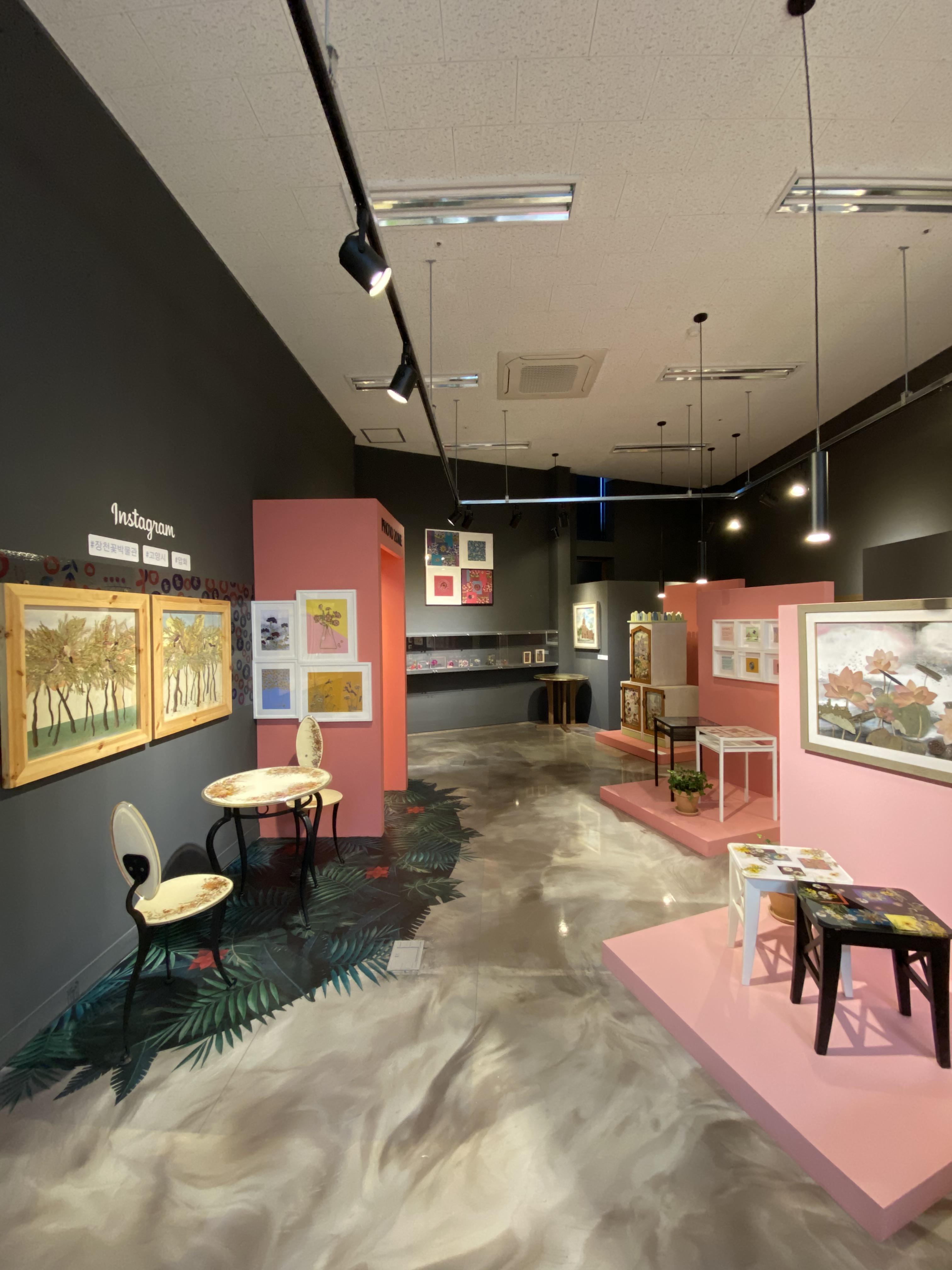제2전시실은 전체적으로 어둡게 계획했으며, 핑크와 바이올렛 컬러를 포인트로 적용하였다. 더욱이 바이올렛 컬러 도어를 열면 나오는 세미나실이 역시 자연 친화적인 압화 작품처럼 편안하고 싱그러운 오가닉 감성이 느껴지도록 계획했다.