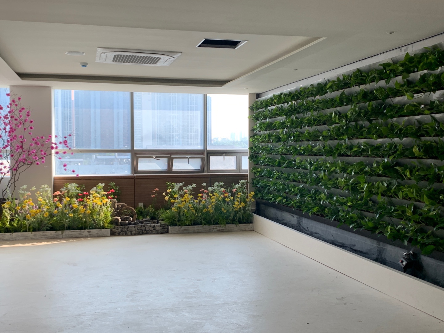 환자들의 휴식공간이 될 실내정원의 조경은 요즘 요청이 많은 스마트팜을 이용해 진행되었습니다. 조화가 아닌 살아 숨 쉬는 식물로 한쪽 벽을 구성하여 공간에 생기를 더했습니다. 식물로 채워진 공간은 호스피스 병동의 최고 힐링 공간이 되어 이곳에 머물 환자들에게 선물 같은 공간이 될 것이라 생각합니다.