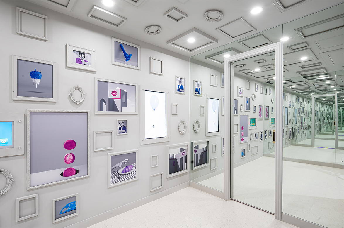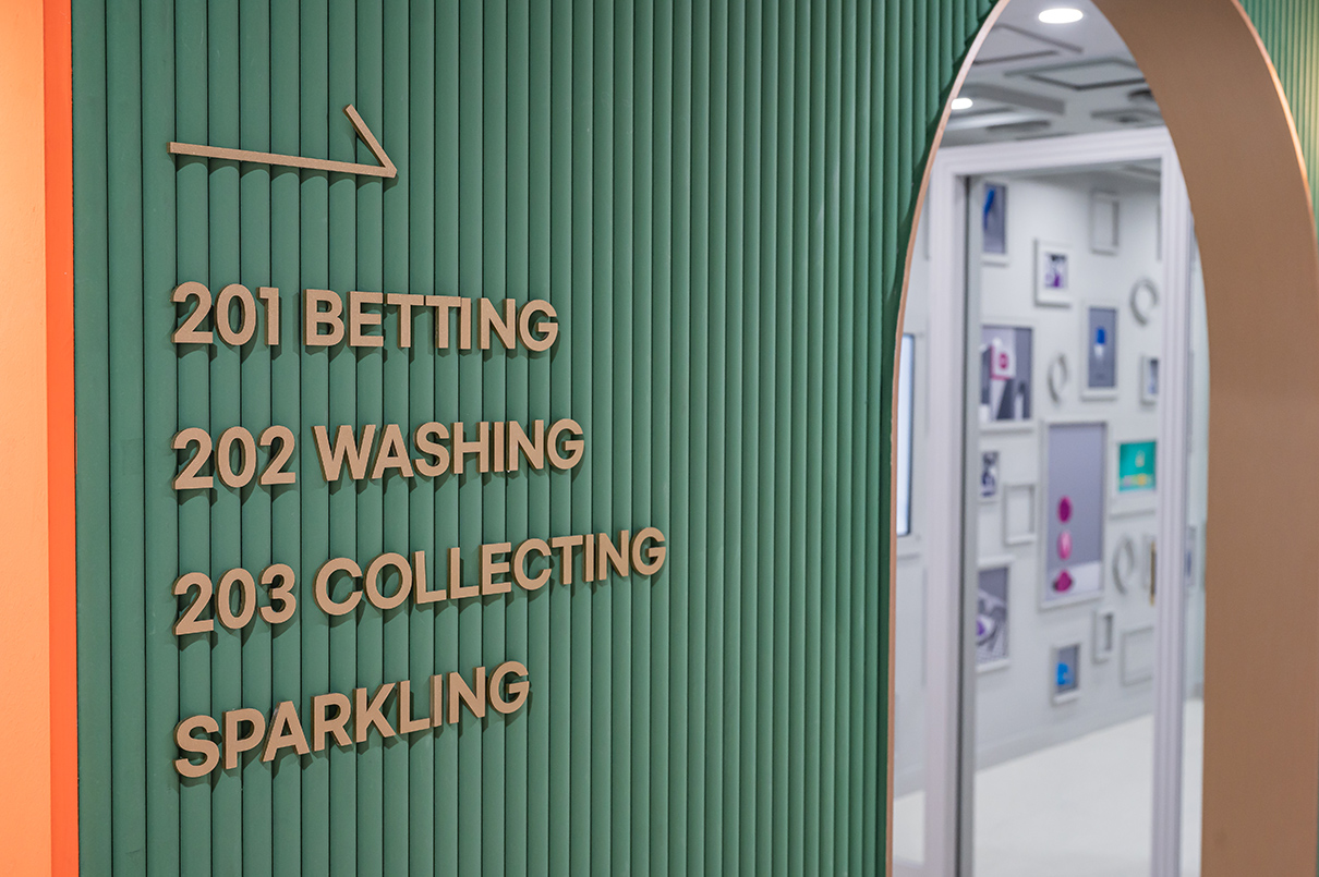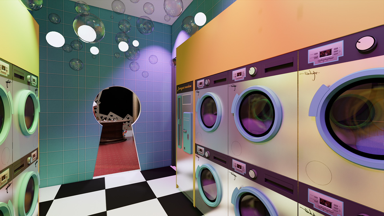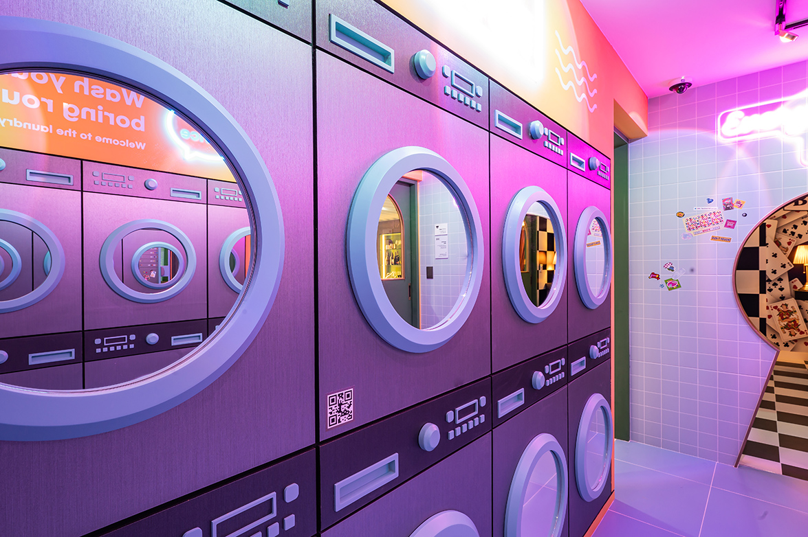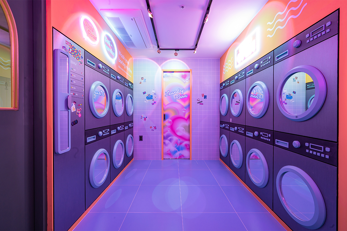 갤러리 공간은 액자를 일일이 수작업으로 분리해 도장했으며, 디자인팀에서 그림을 제작해 다채롭게 꾸며냈다. 특히 이곳은 양옆 벽면을 거울로 적용했으며, 이로 인해 액자 속 그림이 계속해서 연속적으로 보이는 연속성을 부여한다.세탁실은 좀 더 키치한 느낌이다. 전체 오렌지 컬러로 포인트를 주었으며, 네온사인 조명으로 환상적인 분위기를 유도했다. 또한 곳곳에 선셋 조명을 비춰 노을 진 해변가 분위기를 연상시킨다. 특히 세탁기는 MDF 합판으로 손수 제작했으며, 버튼의 경우 CNC 가공으로 하나하나 붙여 공을 들인 점을 알 수 있다.