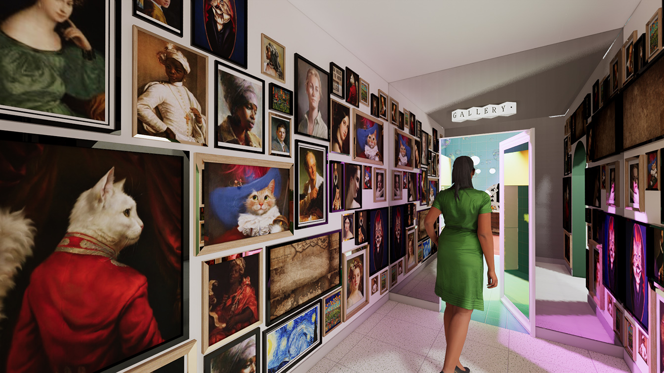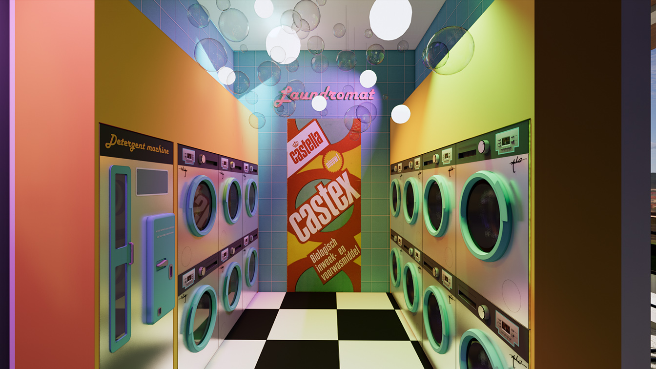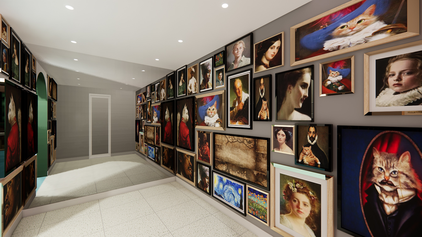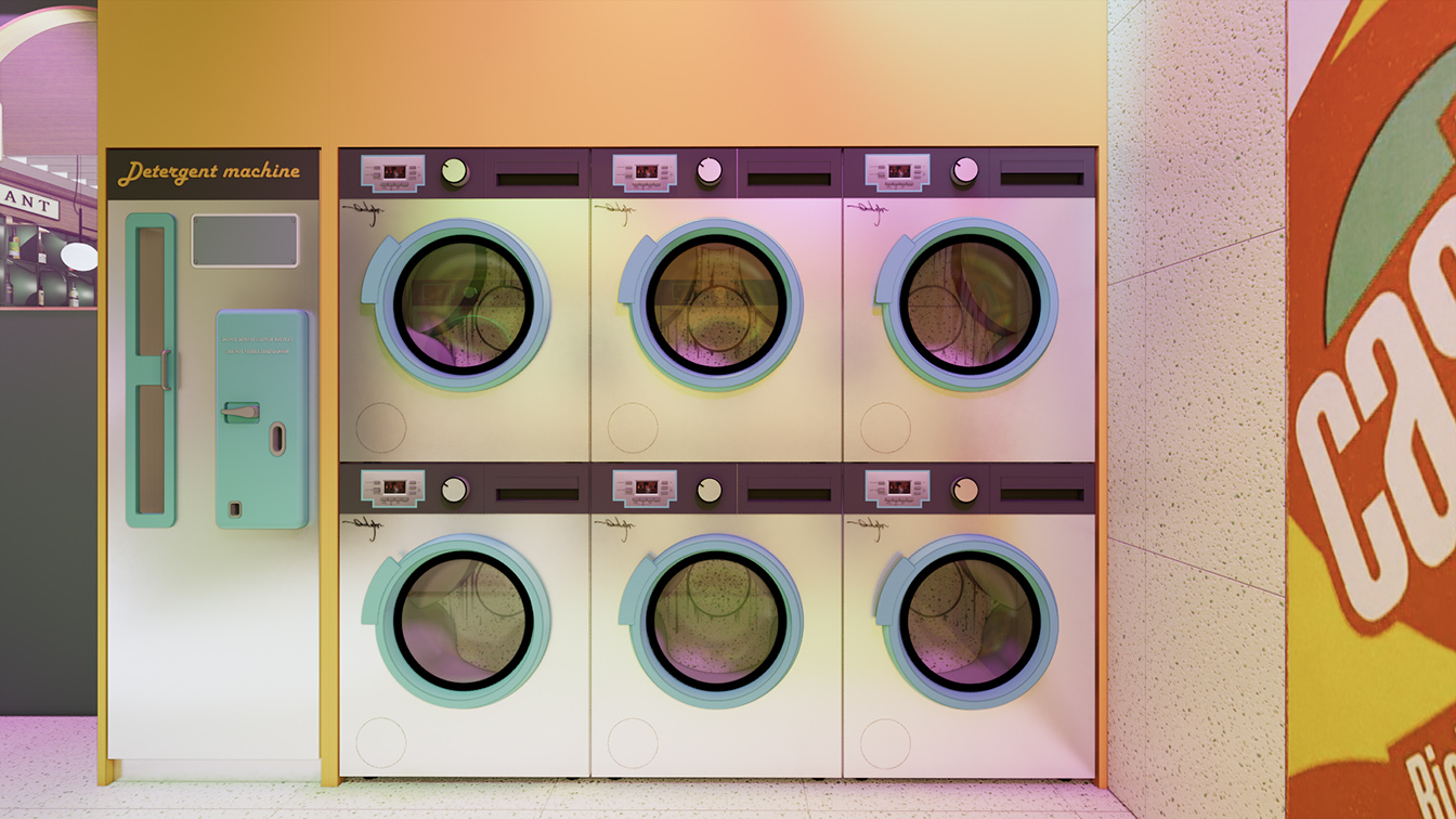 갤러리 공간은 액자를 일일이 수작업으로 분리해 도장했으며, 디자인팀에서 그림을 제작해 다채롭게 꾸며냈다. 특히 이곳은 양옆 벽면을 거울로 적용했으며, 이로 인해 액자 속 그림이 계속해서 연속적으로 보이는 연속성을 부여한다.세탁실은 좀 더 키치한 느낌이다. 전체 오렌지 컬러로 포인트를 주었으며, 네온사인 조명으로 환상적인 분위기를 유도했다. 또한 곳곳에 선셋 조명을 비춰 노을 진 해변가 분위기를 연상시킨다. 특히 세탁기는 MDF 합판으로 손수 제작했으며, 버튼의 경우 CNC 가공으로 하나하나 붙여 공을 들인 점을 알 수 있다.
