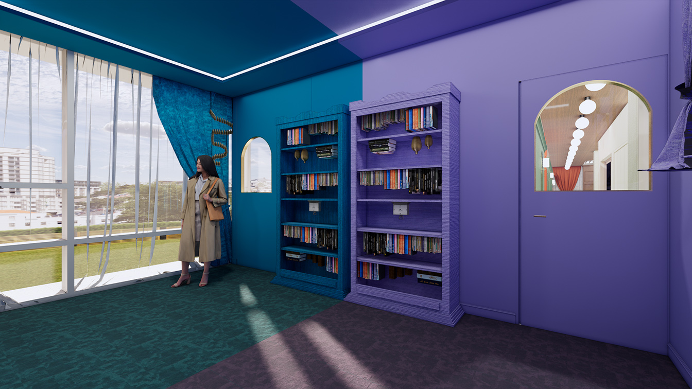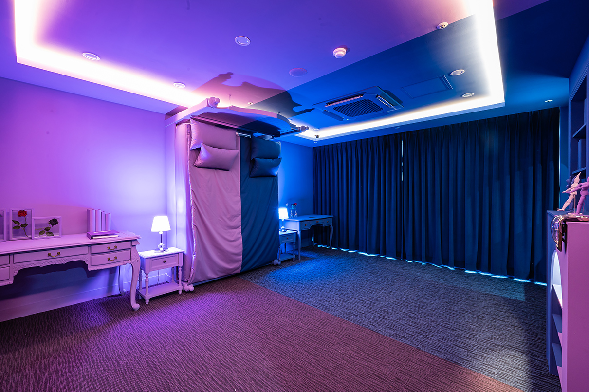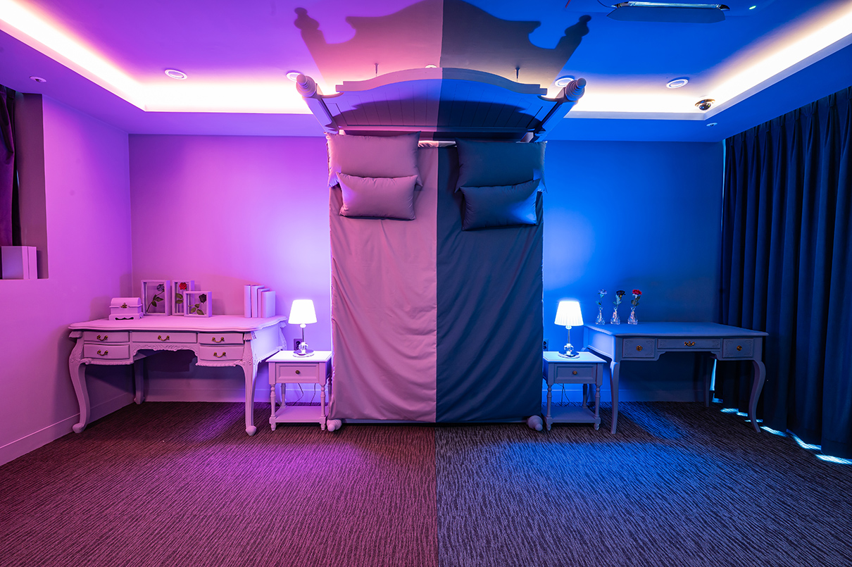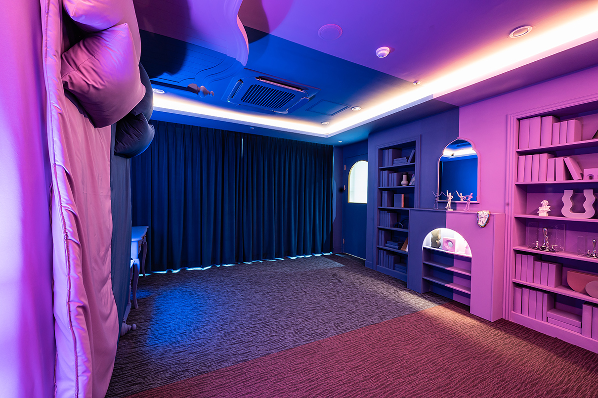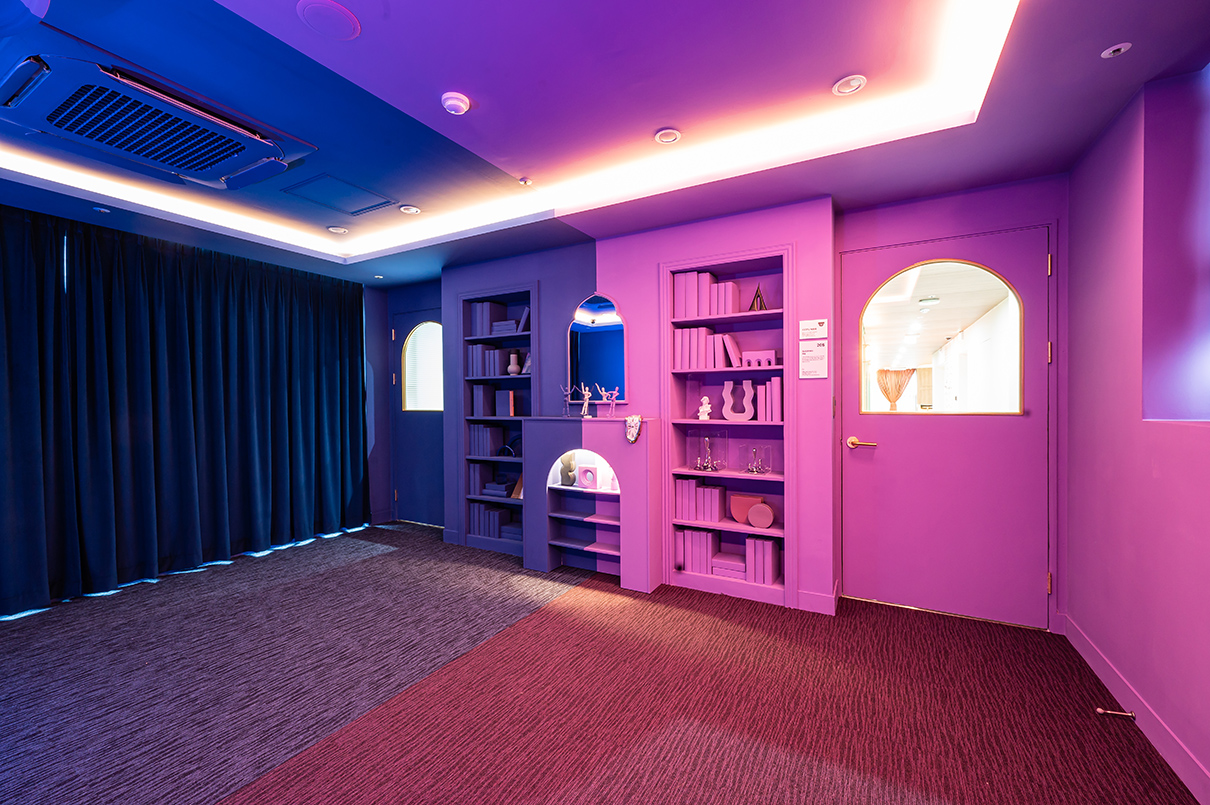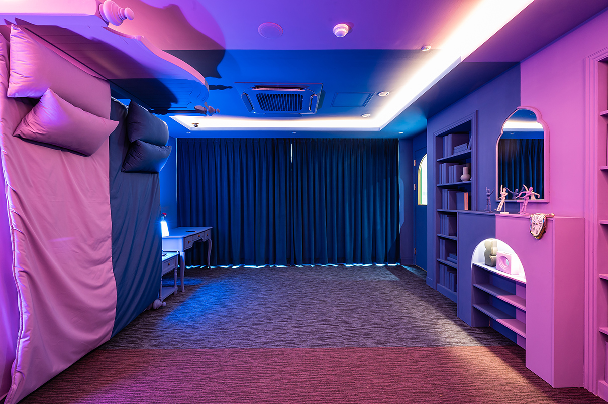 라운지 반대쪽 끝에는 객실이 마련되었다. 객실은 데칼코마니처럼 침대 중앙을 대칭으로 똑같이 연출했으며, 바이올렛 컬러와 블루 컬러로 분리감을 주었다.