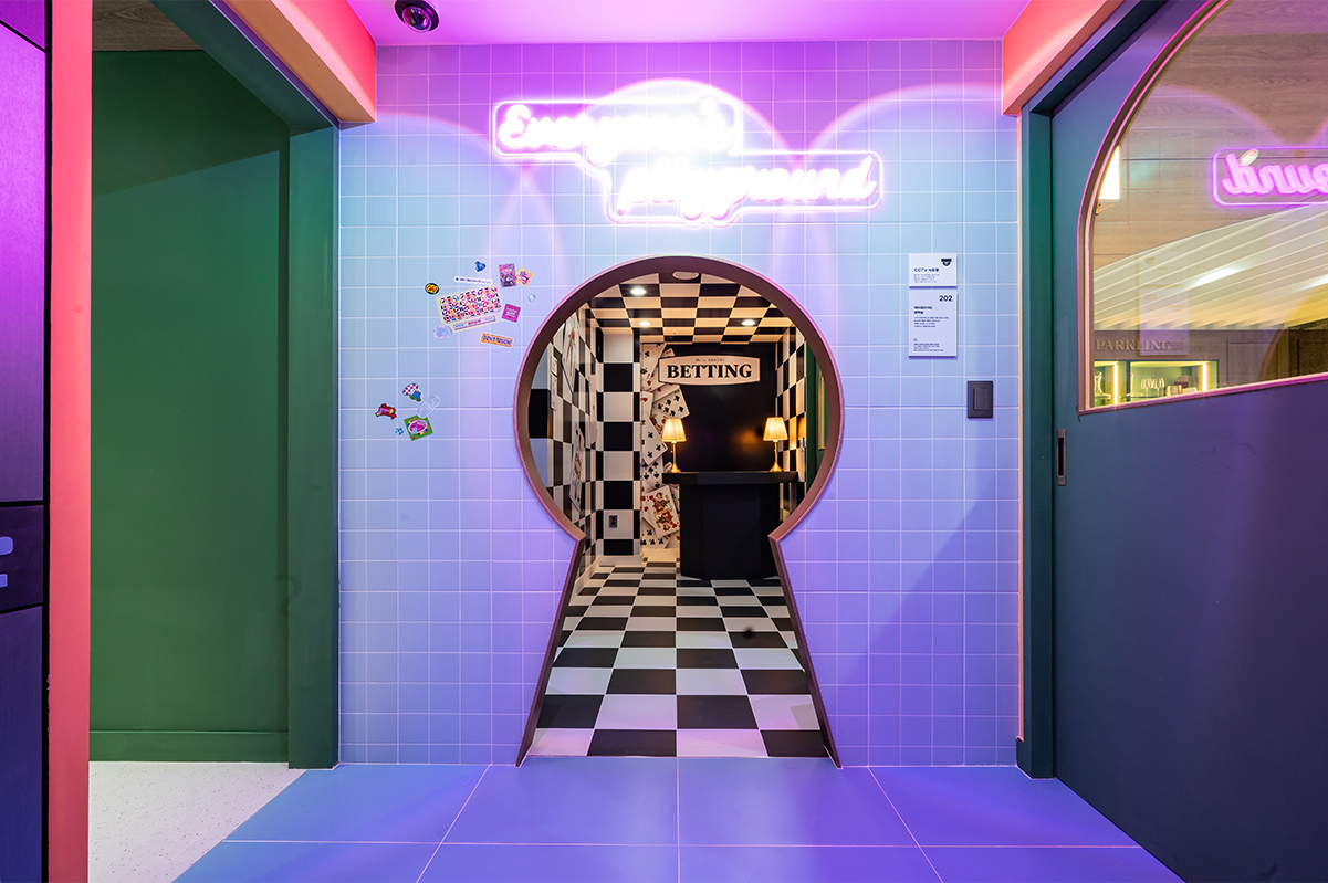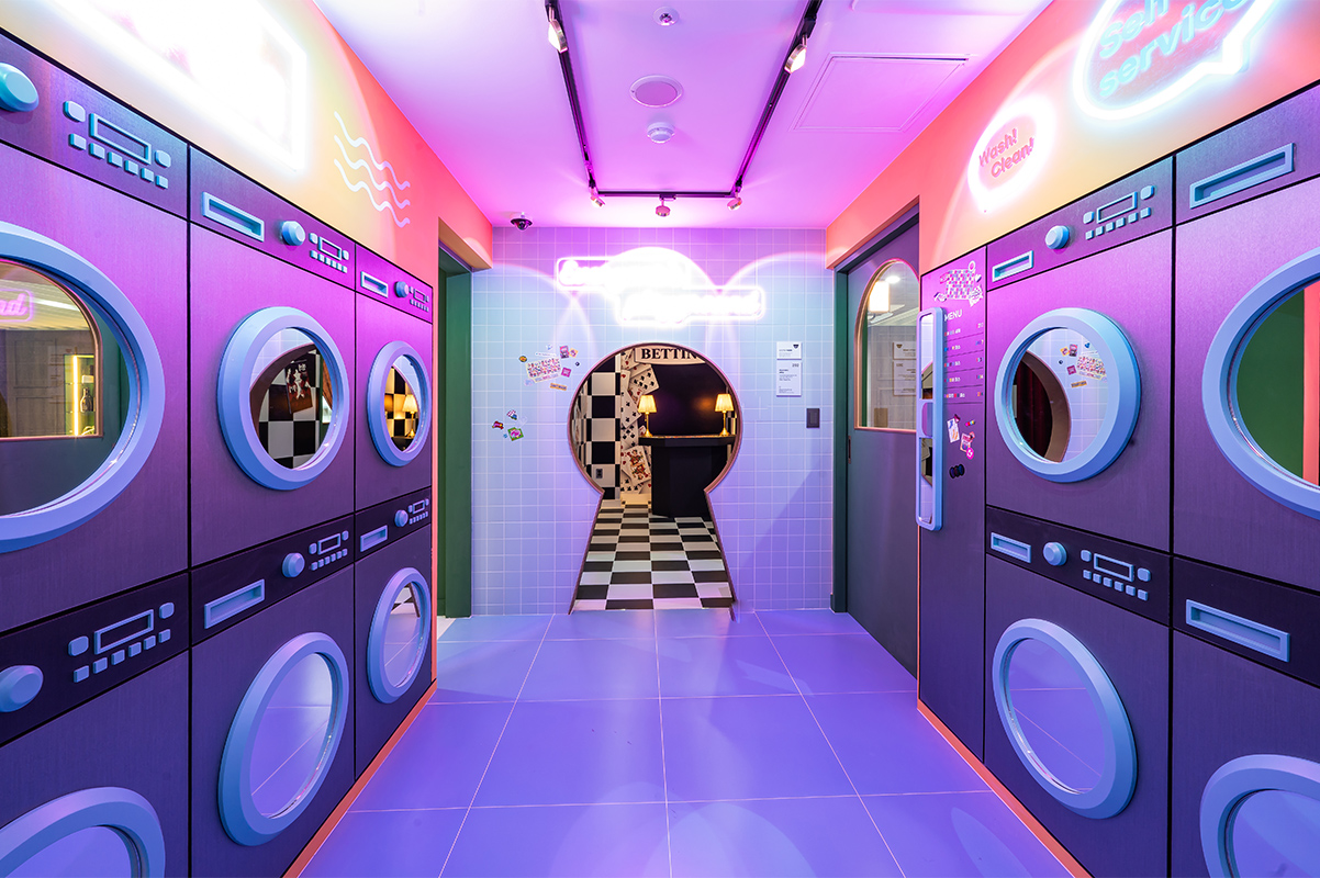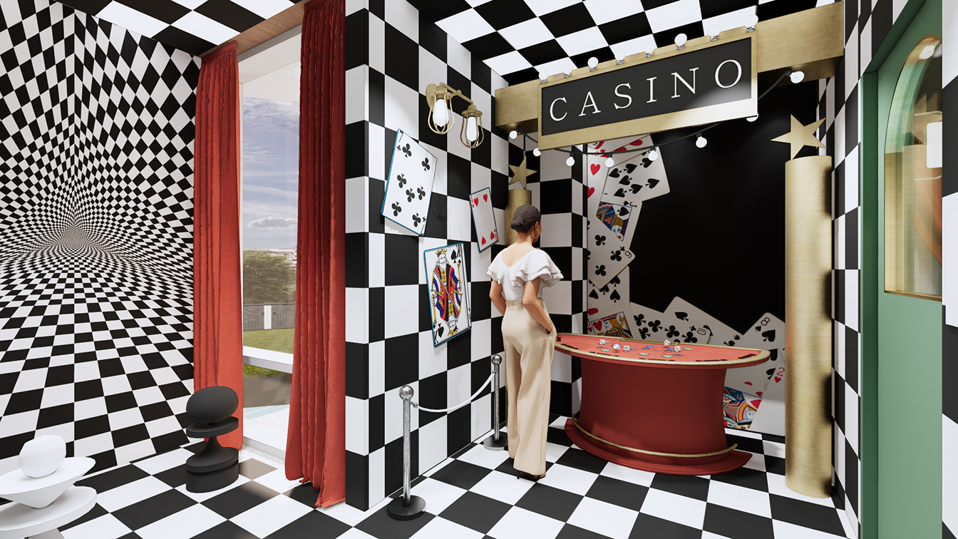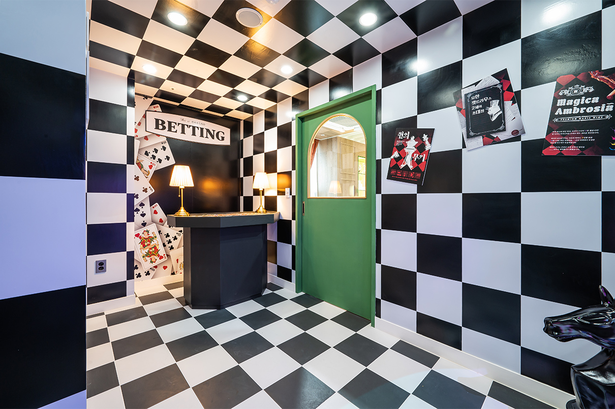 세탁실에서 카지노 방으로 연결된 문은 포커에서 착안한 열쇠 모양으로 디자인했다. 디자이너는 “일부러 신경 써서 지나가도록 불편함을 주기 위해 연출했다”라고 설명했다. 이 역시도 형식에 구애받지 않고 고객들에게 재미와 상상력을 심어주기 위해 디자인된 것임을 알 수 있다. 카지노 방은 마치 ‘이상한 나라의 앨리스’에 나온 체스판처럼 전체 공간에 적용했으며, 한쪽 벽면은 미로 속에 빨려 들어가는 듯한 비현실적인 느낌을 자아낸다. 이곳에 설치된 조명의 경우 핸드폰 어플로 조절이 가능해 원하는 대로 컬러를 다양하게 바꿀 수 있다.