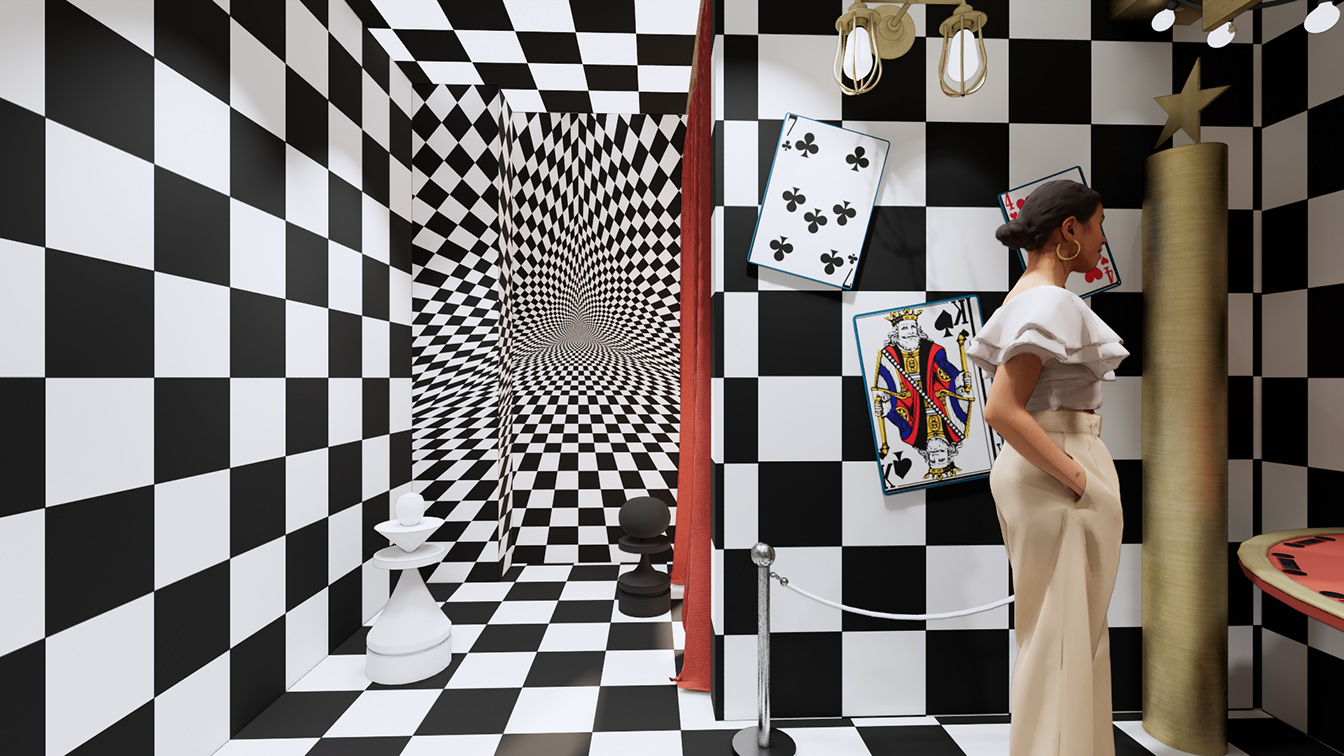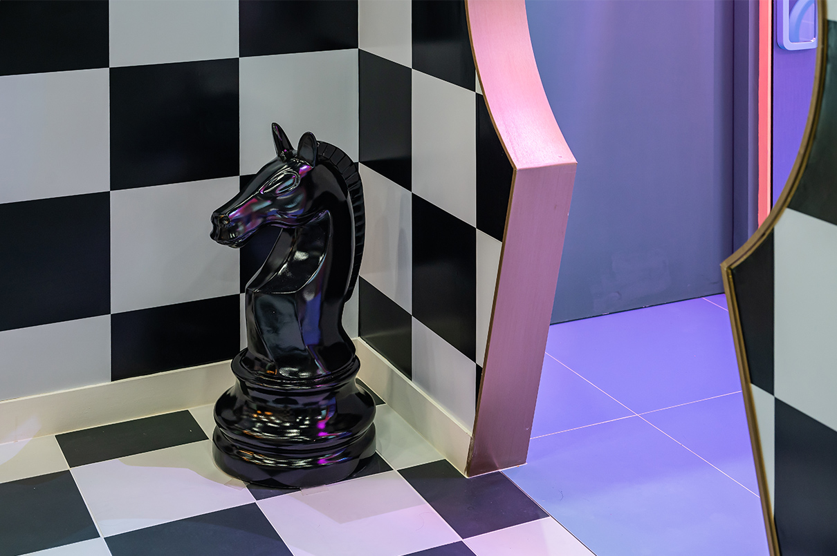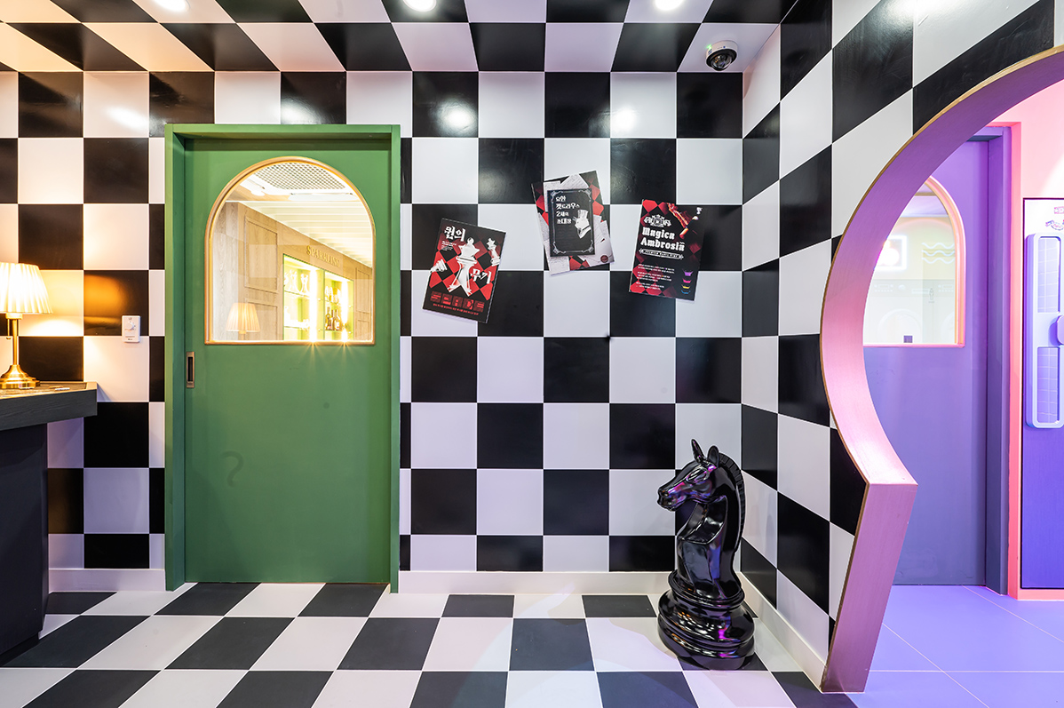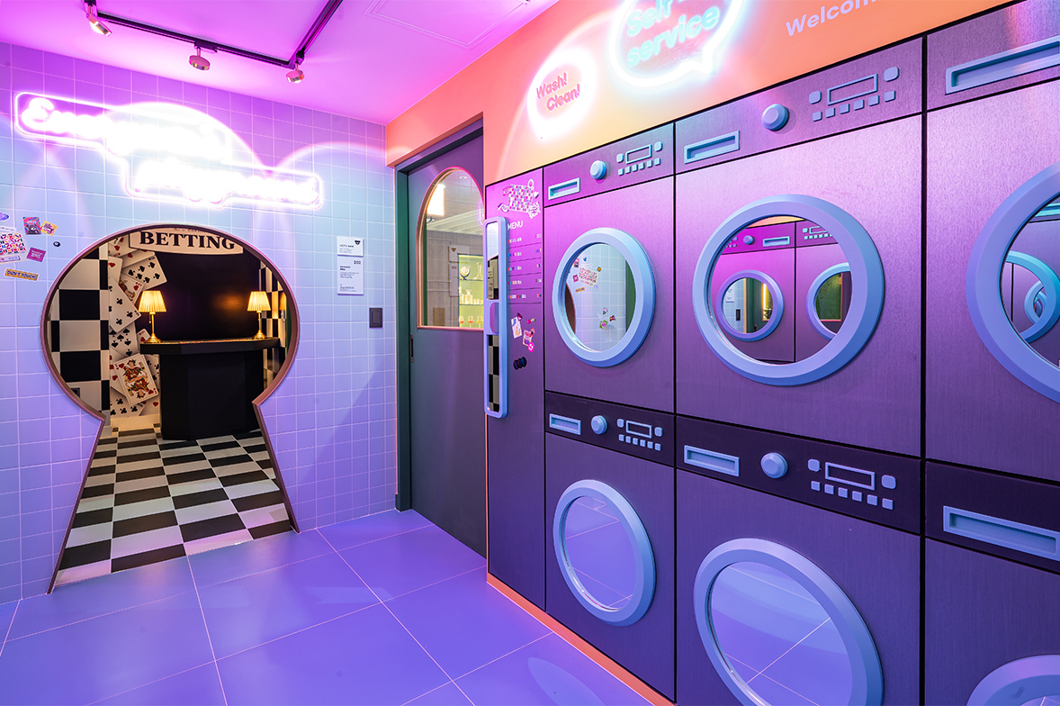세탁실에서 카지노 방으로 연결된 문은 포커에서 착안한 열쇠 모양으로 디자인했다. 디자이너는 “일부러 신경 써서 지나가도록 불편함을 주기 위해 연출했다”라고 설명했다. 이 역시도 형식에 구애받지 않고 고객들에게 재미와 상상력을 심어주기 위해 디자인된 것임을 알 수 있다. 카지노 방은 마치 ‘이상한 나라의 앨리스’에 나온 체스판처럼 전체 공간에 적용했으며, 한쪽 벽면은 미로 속에 빨려 들어가는 듯한 비현실적인 느낌을 자아낸다. 이곳에 설치된 조명의 경우 핸드폰 어플로 조절이 가능해 원하는 대로 컬러를 다양하게 바꿀 수 있다.