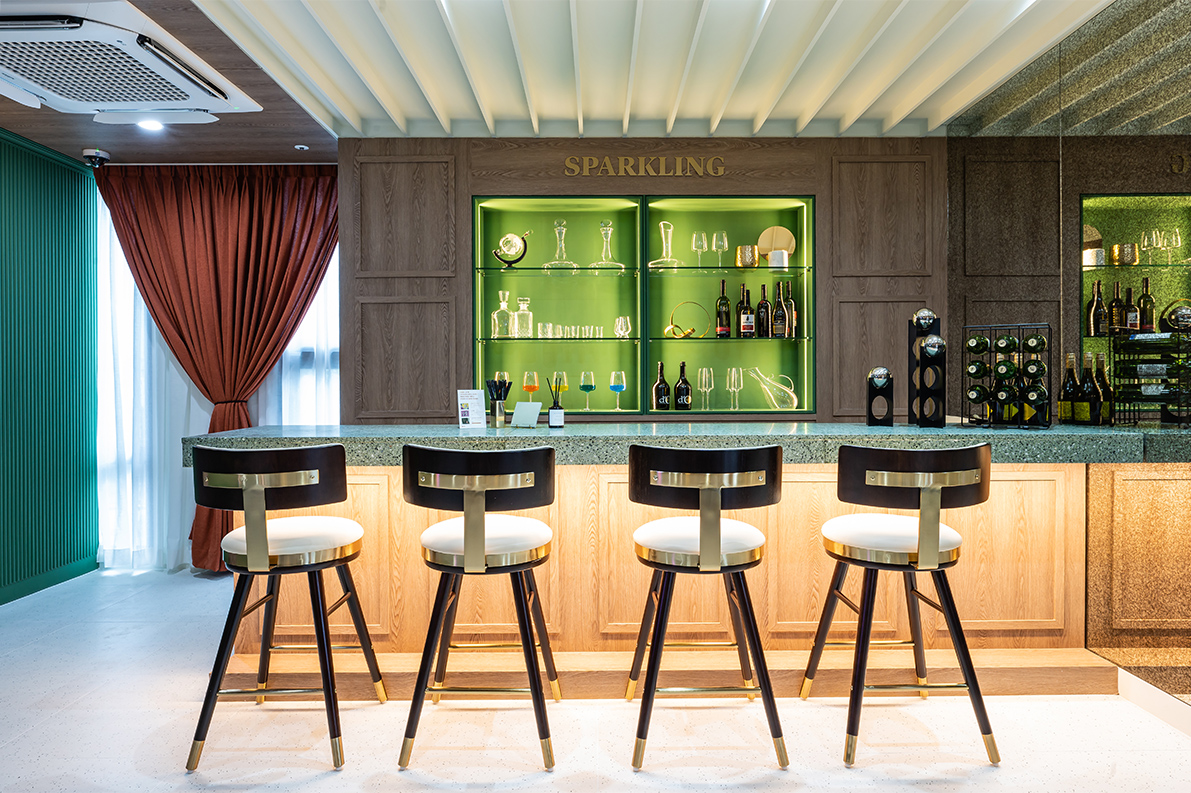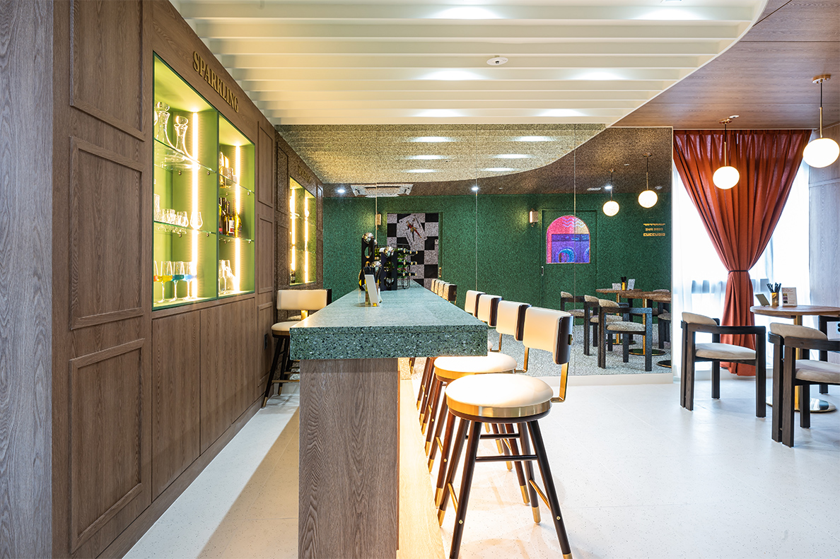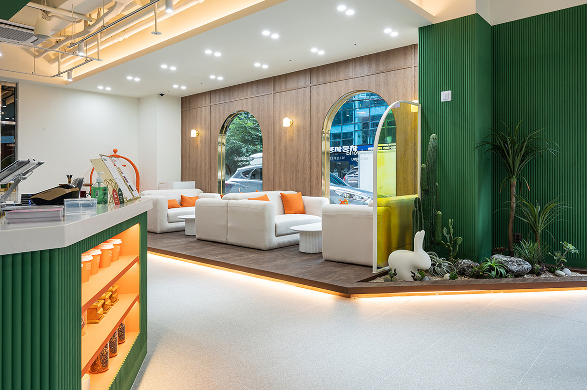 아치형의 창가 쪽은 아이보리 컬러의 소파를 두었으며, 바닥은 우드 컬러로 테라조타일 바닥 마감과 마감재를 달리해 단차감을 주었다. 특히 파티션 유리는 홀로그램 필름을 입혀 은은한 오로라 분위기를 연출해낸 점이 독특하다. 더욱이 소파가 놓인 공간에만 천정을 덧댄 매립등으로 무대와 같은 분위기가 조성되었다. 이와 함께 아치형 창문이나 벽등, 행잉 사인 등 곳곳에 골드 프레임으로 고급스럽게 포인를 준 점도 눈에 띈다.