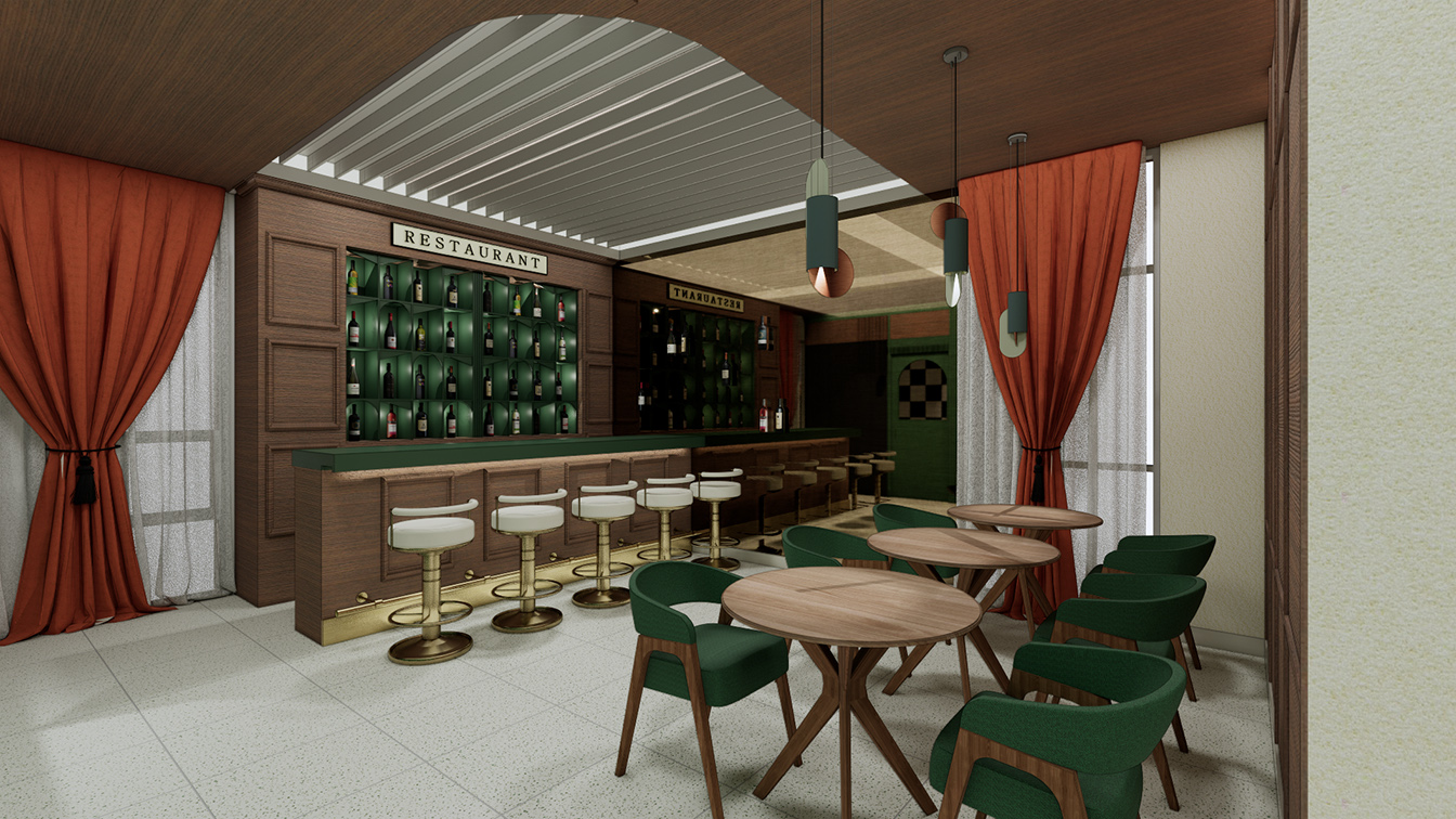 2층은 호텔의 컨셉을 각 실별로 보다 과감하고 신비롭게 풀어낸 점이 눈에 띈다. 먼저 2층 복도 맨 끝에는 라운지 공간이 등장한다. 이곳은 와인바 컨셉으로 디자인되었으며, 천정과 벽, 가구를 우드로 선택해 화려한 컬러감을 한 단계 다운시켜 차분한 분위기가 조성되었다. 편안하게 연출된 라운지 공간 한쪽 벽면은 유리로 적용했으며, 전체 앤틱경으로 독특한 분위기를 자아낸다. 앤틱경은 은경을 부식시킨 패턴으로, 1810년대 호텔의 분위기와 너무나도 잘 어우러진다. 또한 라운지바 상판은 카키색의 인조대리석으로 마감했으며, 곡선의 라인감을 준 천정 루버를 그대로 흡수하고 있다.