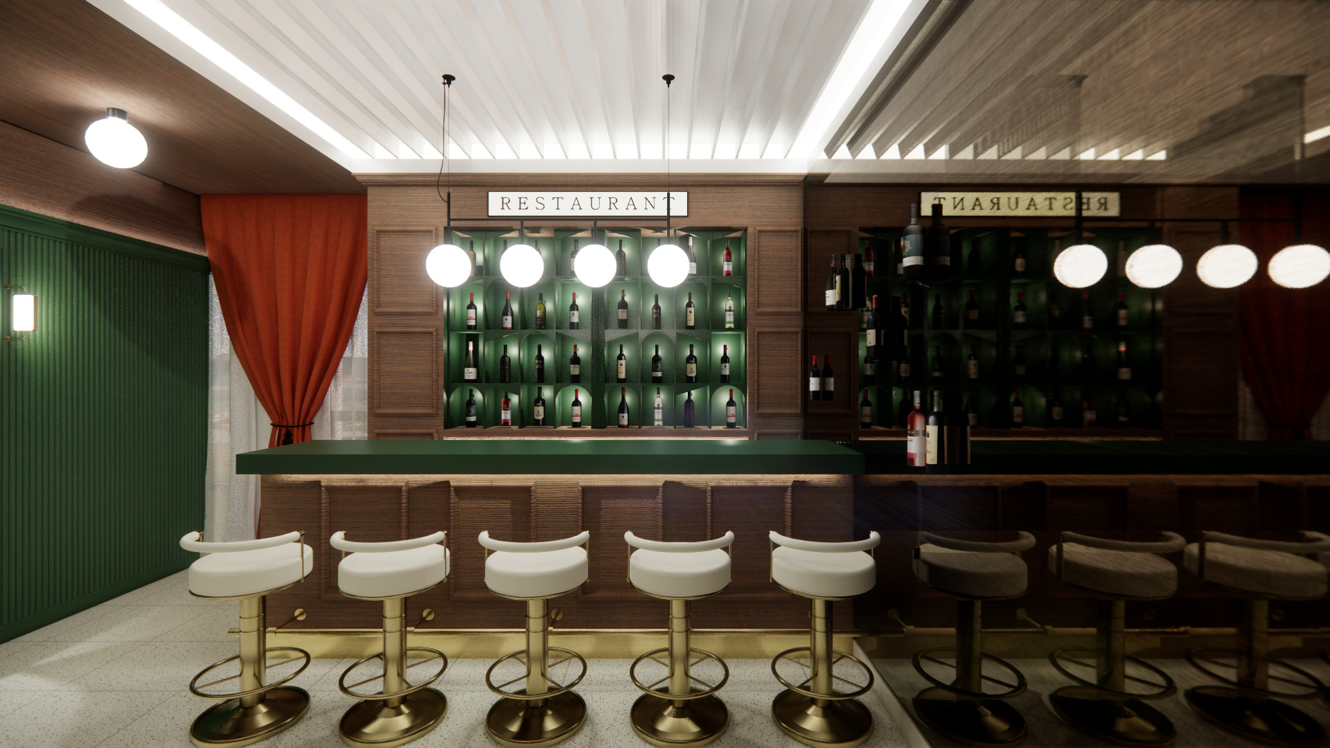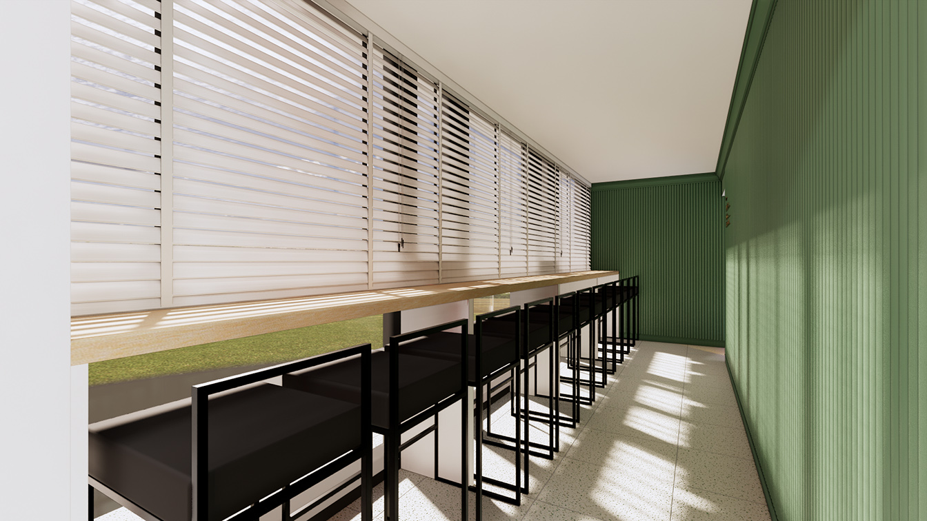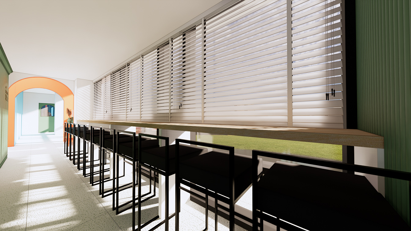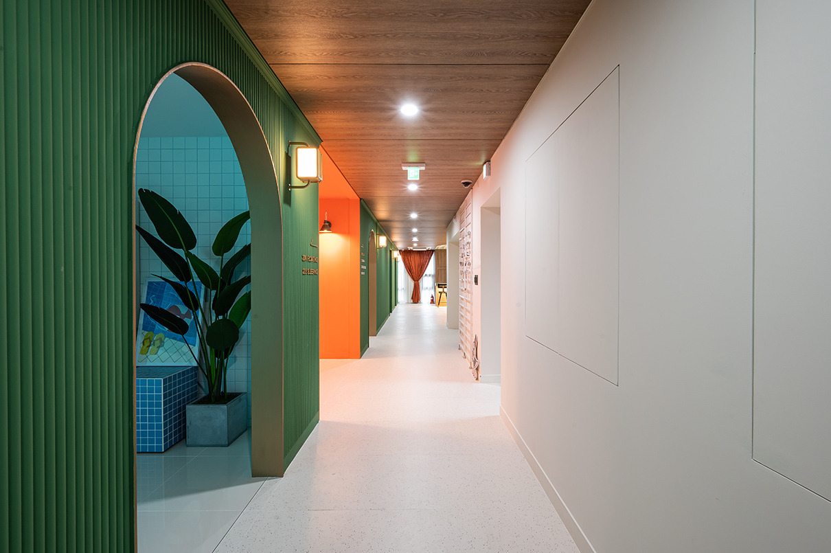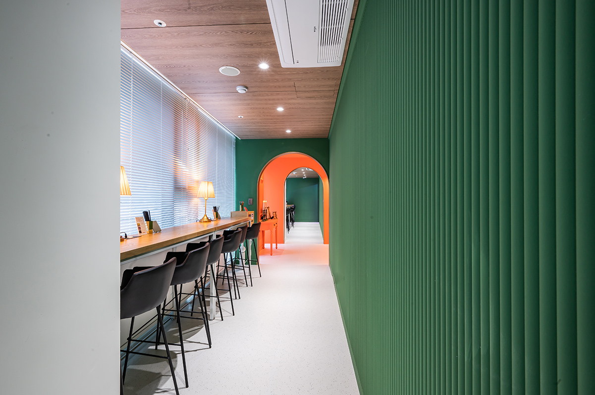 창가 쪽은 휴게공간과 아치형 복도로 이루어져 있다. 이곳의 전체 벽면은 그린 컬러의 템바보드로 적용되었으며, 골드 빛의 아치 디자인으로 포인트를 주었다. 더욱이 창가 쪽은 고객들이 게임을 즐기다가 잠시 휴식할 수 있는 공간으로 은은한 조명빛이 더해져 아늑한 분위기가 느껴진다.