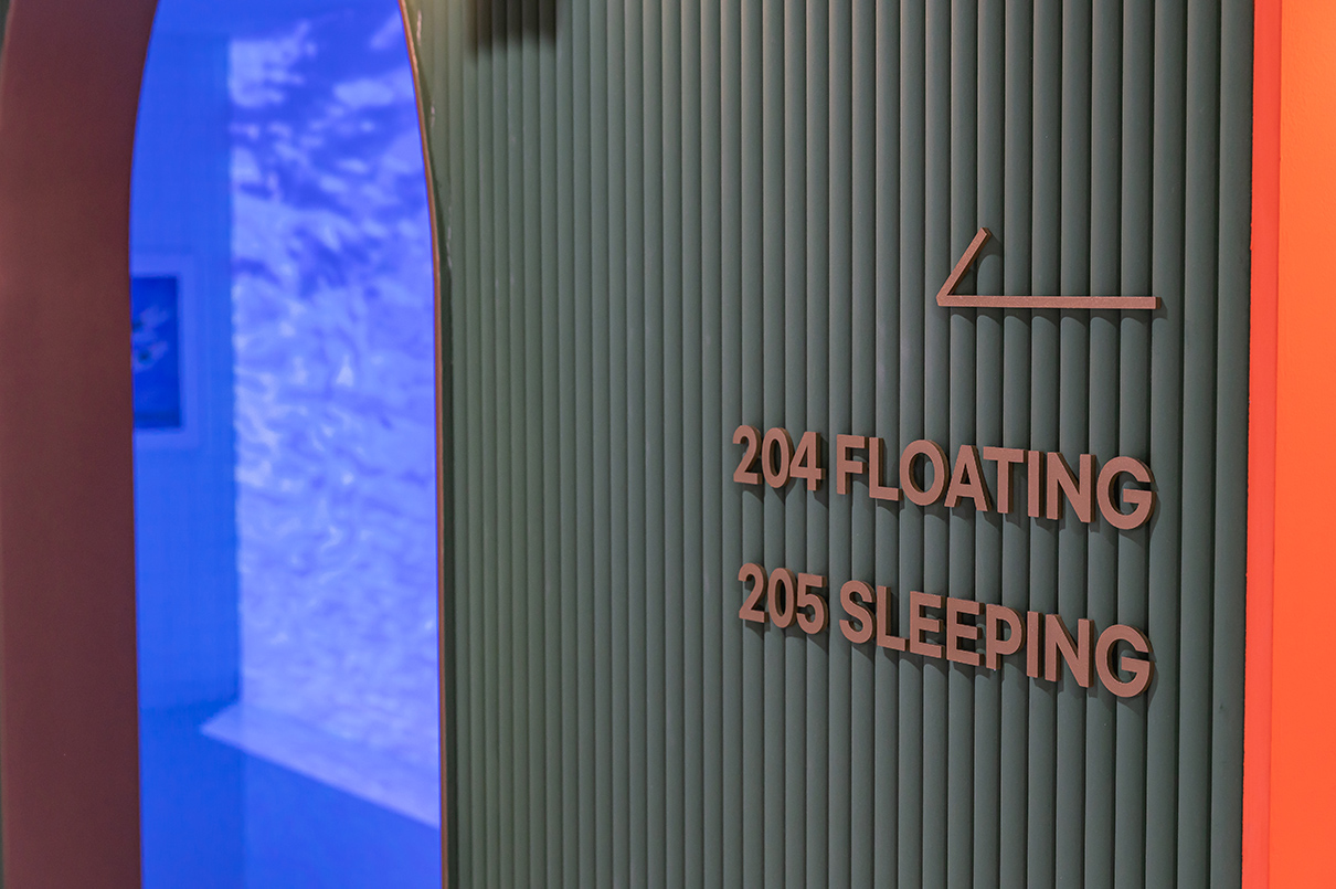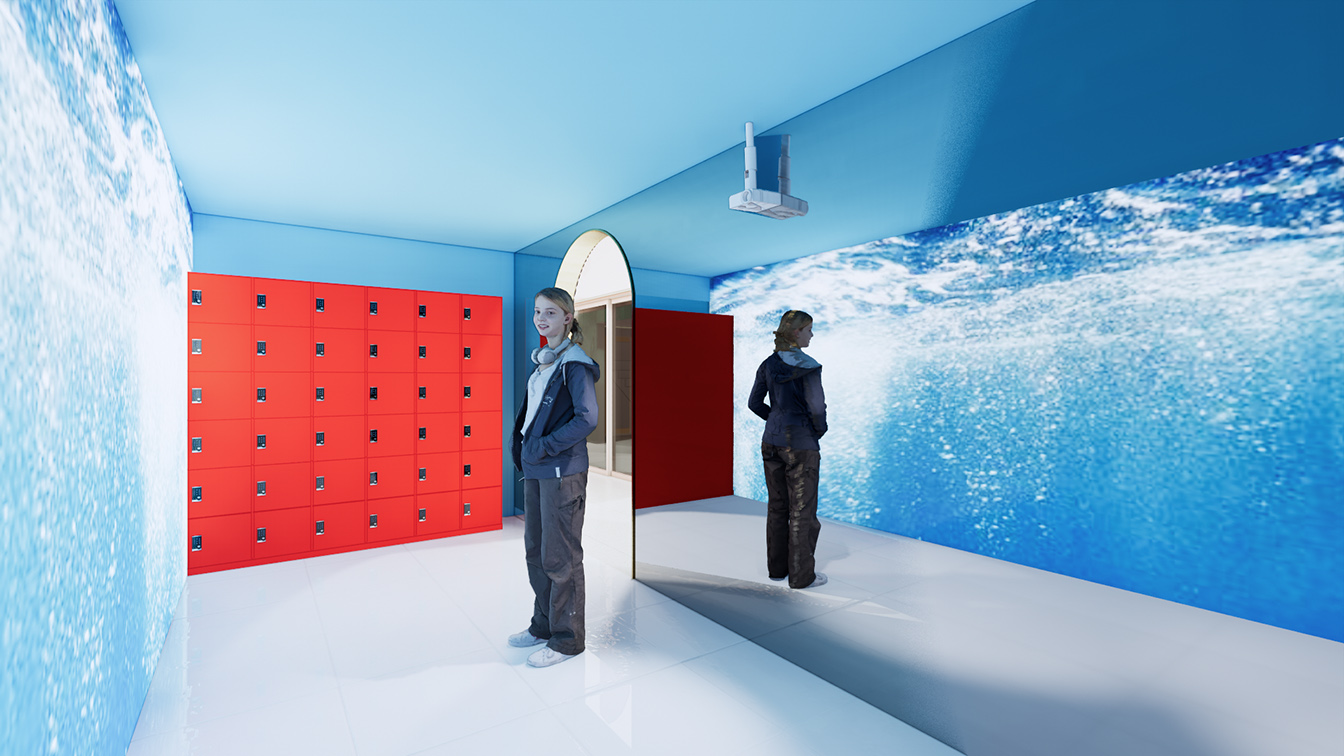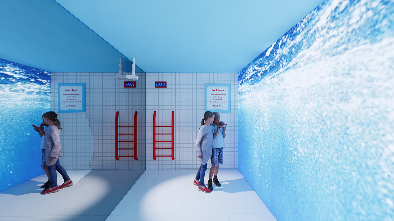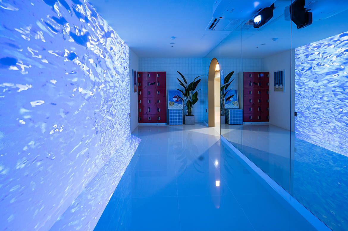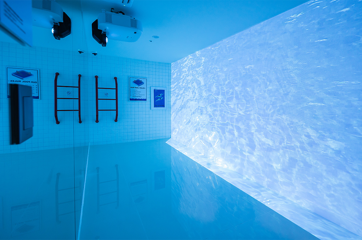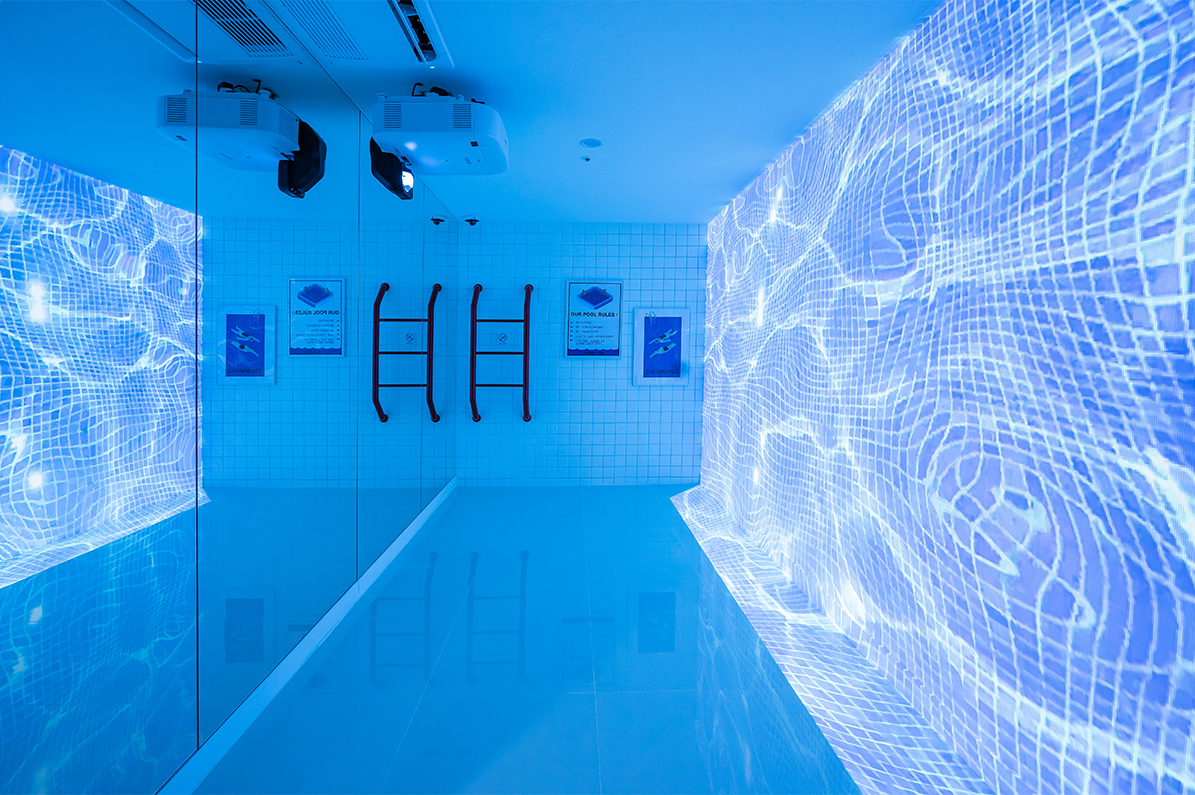 수영장은 일본 가나자와 21세기 미술관 내 ‘The Swimming Pool’을 모티브로 하고 있다. 이곳은 투명 유리에 담긴 물을 통해 수영장 밑으로 사람이 걸어 다닐 수 있고, 수영장 바닥에서 바깥을 볼 수가 있게 착시현상을 불러일으킨다. 디자이너는 이번 수영장을 디지털 영상의 파노라마 형식으로 풀어냈으며, 한쪽 벽면을 전체 거울로 마감해 물속에 있는 듯한 확장감을 안겨준다. 바닥은 유광타일로 마감해 영상 속 화면이 한층 빛나 보이도록 연출한 점도 눈에 띈다 .