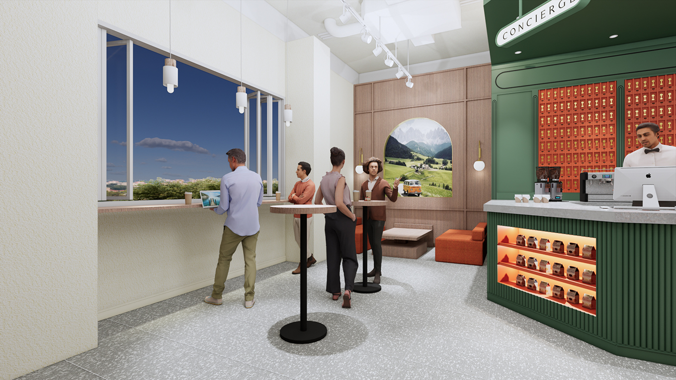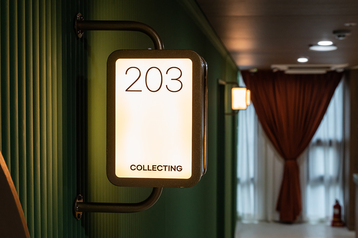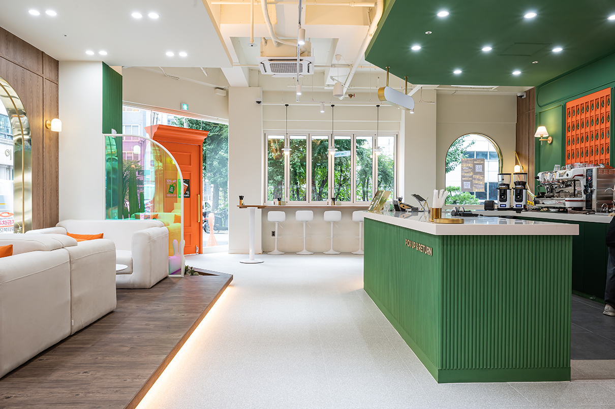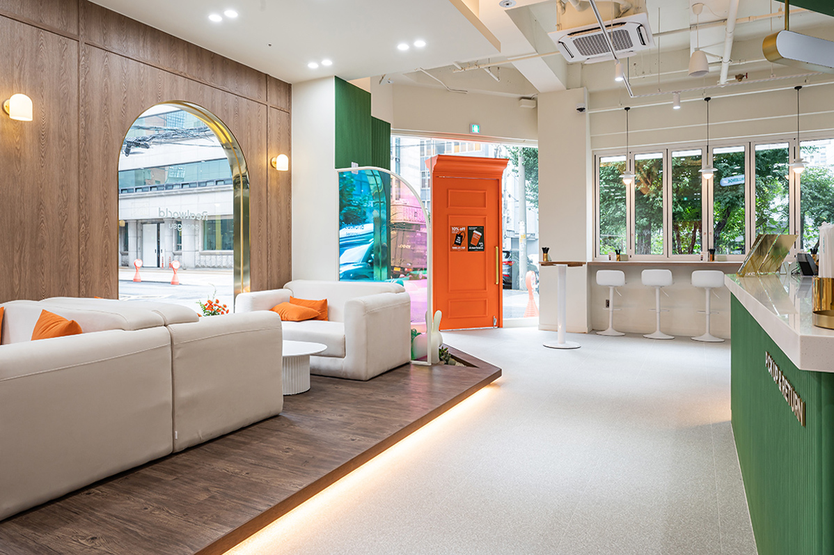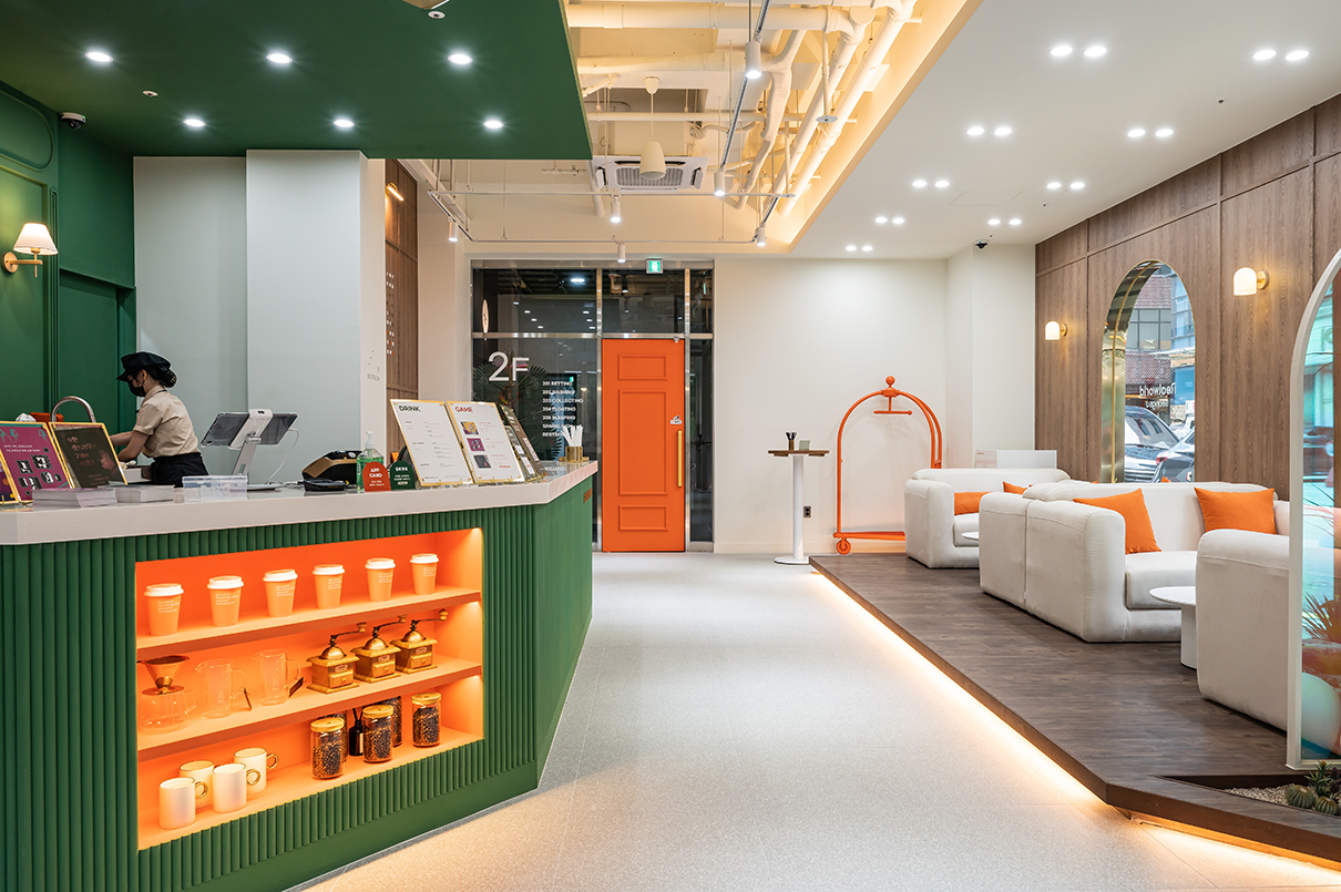 1층 카페와 굿즈샵 입구 문은 오렌지 컬러로 포인트를 주었으며, 크고 장엄하게 연출되었다. 특히 도어에 몰딩을 넣어 고급스러우면서 클래식한 분위기가 느껴진다. 디자이너는 “문을 여는 순간, 마치 다른 세계로 들어간다”라는 느낌을 주고자 도어를 웅장하게 디자인했다고 설명했다. 영어로 컨시어지(CONCIERGE)의 행잉 사인이 설치된 라인은 전체 짙은 그린 컬러로 신선한 이미지를 부여했다. 이곳은 호텔의 정보를 고객에게 전달하는 프런트데스크 공간으로 그린과 오렌지 컬러의 조화가 돋보인다. 프런트데스크 라인은 전체 템바보드로 볼륨감을 주었으며, 안쪽에 적용된 오렌지 컬러 라인에는 객실 열쇠를 진열해 그 옛날 아날로그 감성의 호텔을 차용한 점이 돋보인다.