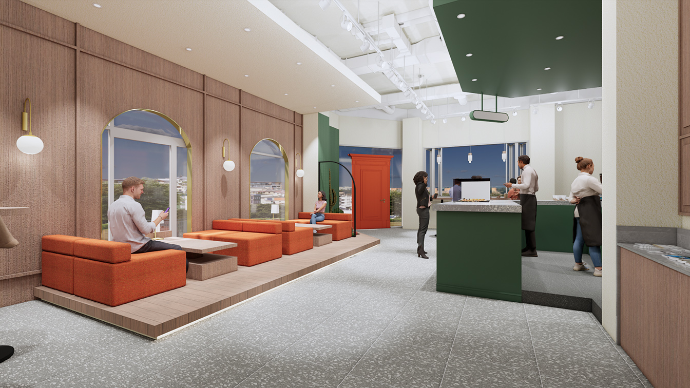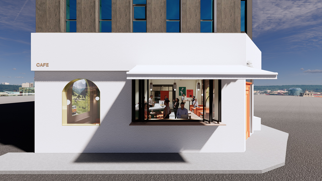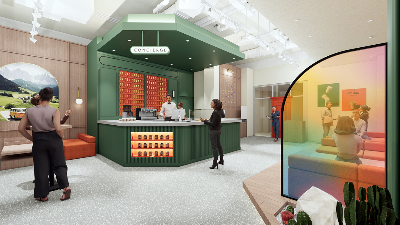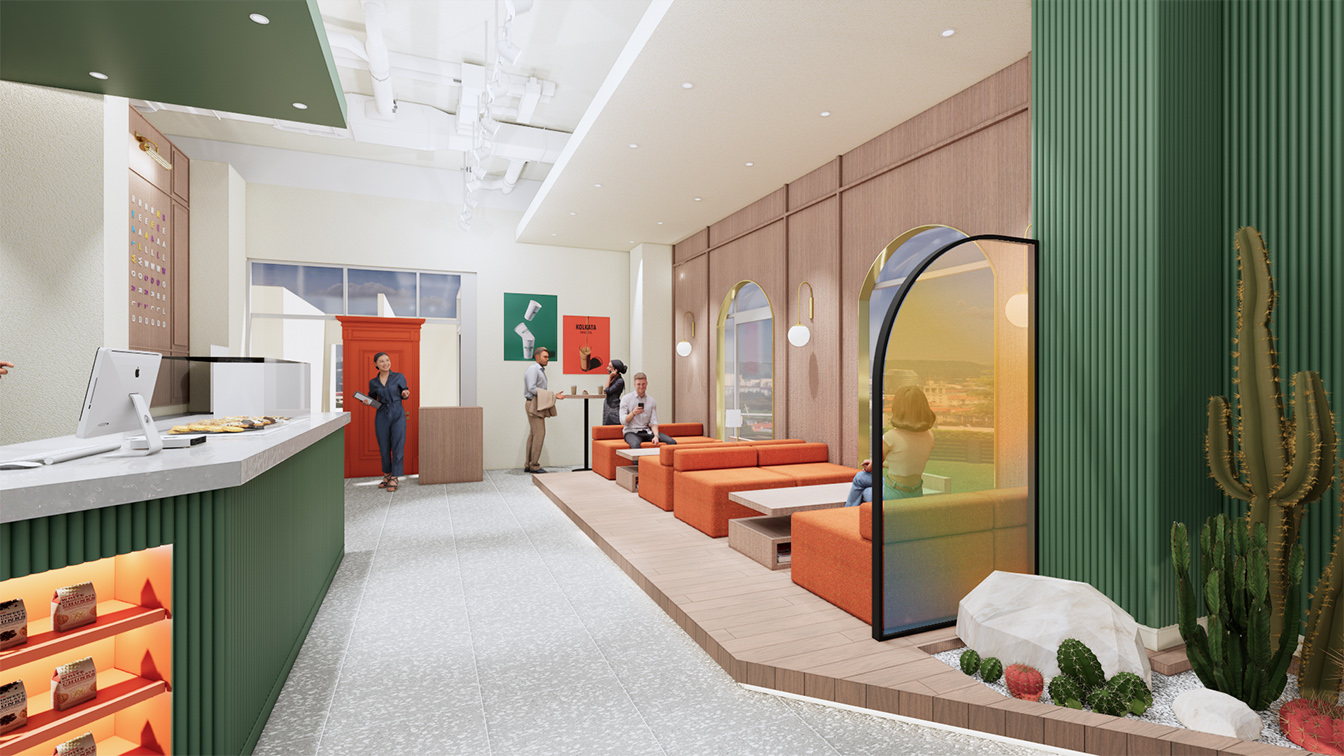 1층 카페와 굿즈샵 입구 문은 오렌지 컬러로 포인트를 주었으며, 크고 장엄하게 연출되었다. 특히 도어에 몰딩을 넣어 고급스러우면서 클래식한 분위기가 느껴진다. 디자이너는 “문을 여는 순간, 마치 다른 세계로 들어간다”라는 느낌을 주고자 도어를 웅장하게 디자인했다고 설명했다. 영어로 컨시어지(CONCIERGE)의 행잉 사인이 설치된 라인은 전체 짙은 그린 컬러로 신선한 이미지를 부여했다. 이곳은 호텔의 정보를 고객에게 전달하는 프런트데스크 공간으로 그린과 오렌지 컬러의 조화가 돋보인다. 프런트데스크 라인은 전체 템바보드로 볼륨감을 주었으며, 안쪽에 적용된 오렌지 컬러 라인에는 객실 열쇠를 진열해 그 옛날 아날로그 감성의 호텔을 차용한 점이 돋보인다.