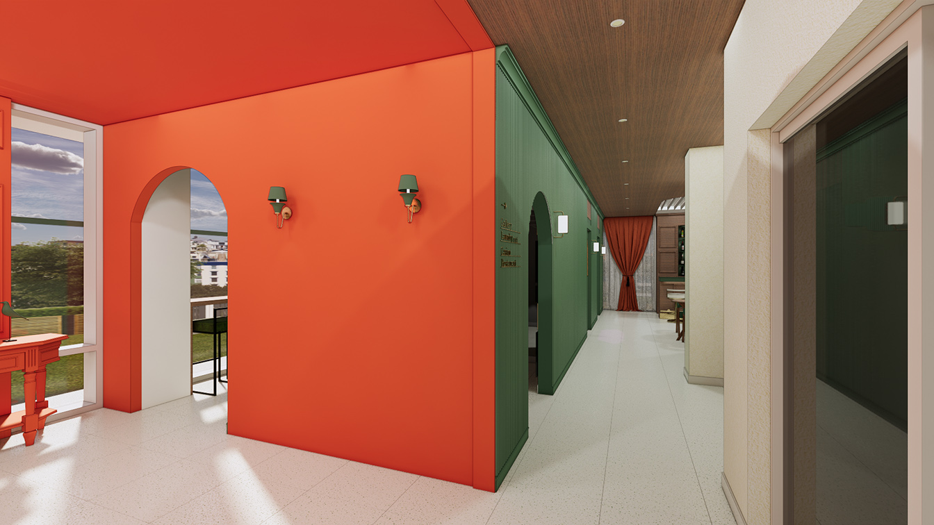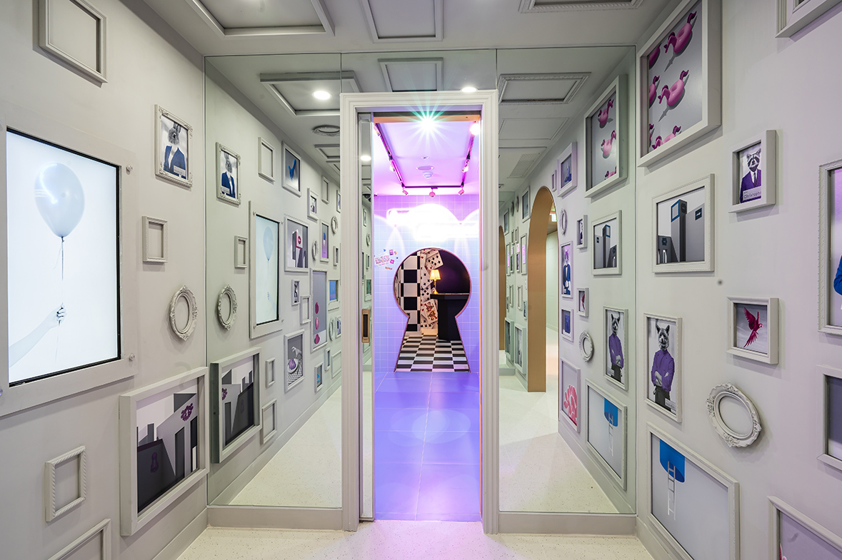 로비는 복도 중앙에 위치한 공간으로 전체 짙은 오렌지 컬러감으로 환상적인 분위기를 자아낸다. 대체로 이번 프로젝트는 그린 컬러의 비율이 높고, 오렌지 컬러는 포인트 정도로만 적용되었다. 하지만 로비만큼은 전체 오렌지 컬러를 입혀 독보적인 화려함을 자아낸다. 더욱이 양옆에 설치된 벽등과 촛대는 그린 컬러로 제작해 키 컬러를 적절하게 활용했음을 알 수 있다. 로비뿐만 아니라 전체 2층은 게임과 포토존으로 손색없는 공간으로 다채롭게 꾸며져 보고, 듣고, 찾는 즐거움을 더해준다.