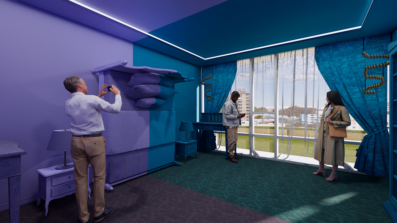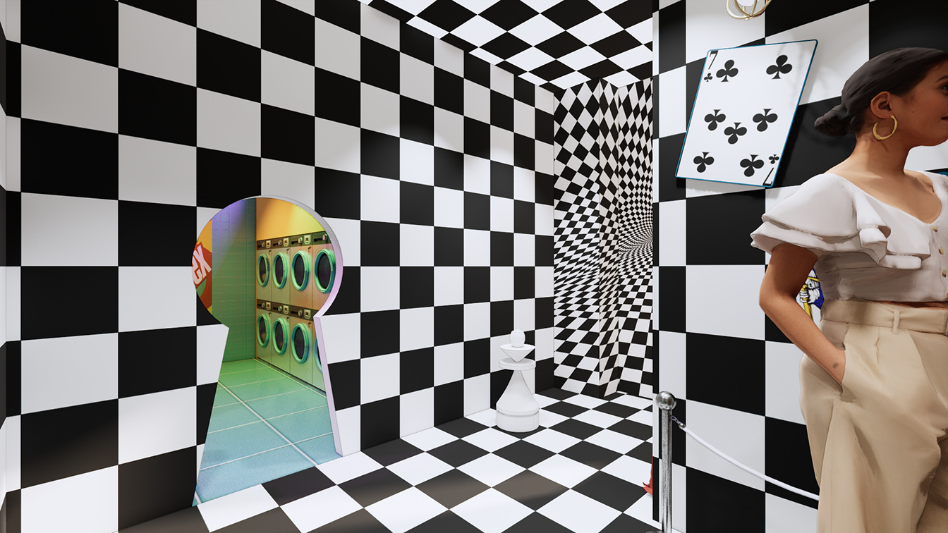 호텔을 컨셉으로 기존의 일반적인 카페나 굿즈샵, 게임체험 공간디자인에서 탈피해 [호텔 리얼월드] 라는 타이틀에 맞춰 구현한 인테리어 프로젝트. 카페, 게임공간인 카지노, 라운지, 세탁실, 갤러리, 수영장, 객실 등 호텔안에서 표현할 수 있는 다양한 컨셉의 공간으로 기획했습니다. 또한 다양한 소품과 조명을 활용해 각 공간 컨셉의 맞춰 포토존으로 연출해 리얼월드만의 상징성을 지닐 수 있는 공간을 제안합니다.