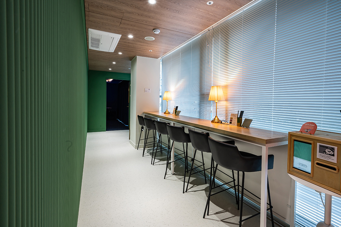 입구 도어 옆 창문은 전체 폴딩도어로 외부와 열린 소통의 중심이 되게 했다. 테이블은 우드 필름으로 내추럴하게 연출했으며, 의자는 화이트 컬러로 전체 조화롭게 구성했다. 특히 테이블 곳곳에는 게임 미션을 수행하는 데 도움이 되도록 메모지와 연필을 둔 점도 알 수 있다.