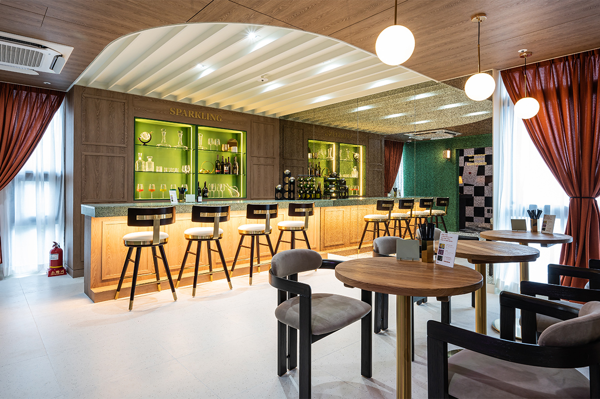 아치형의 창가 쪽은 아이보리 컬러의 소파를 두었으며, 바닥은 우드 컬러로 테라조타일 바닥 마감과 마감재를 달리해 단차감을 주었다. 특히 파티션 유리는 홀로그램 필름을 입혀 은은한 오로라 분위기를 연출해낸 점이 독특하다. 더욱이 소파가 놓인 공간에만 천정을 덧댄 매립등으로 무대와 같은 분위기가 조성되었다. 이와 함께 아치형 창문이나 벽등, 행잉 사인 등 곳곳에 골드 프레임으로 고급스럽게 포인를 준 점도 눈에 띈다.