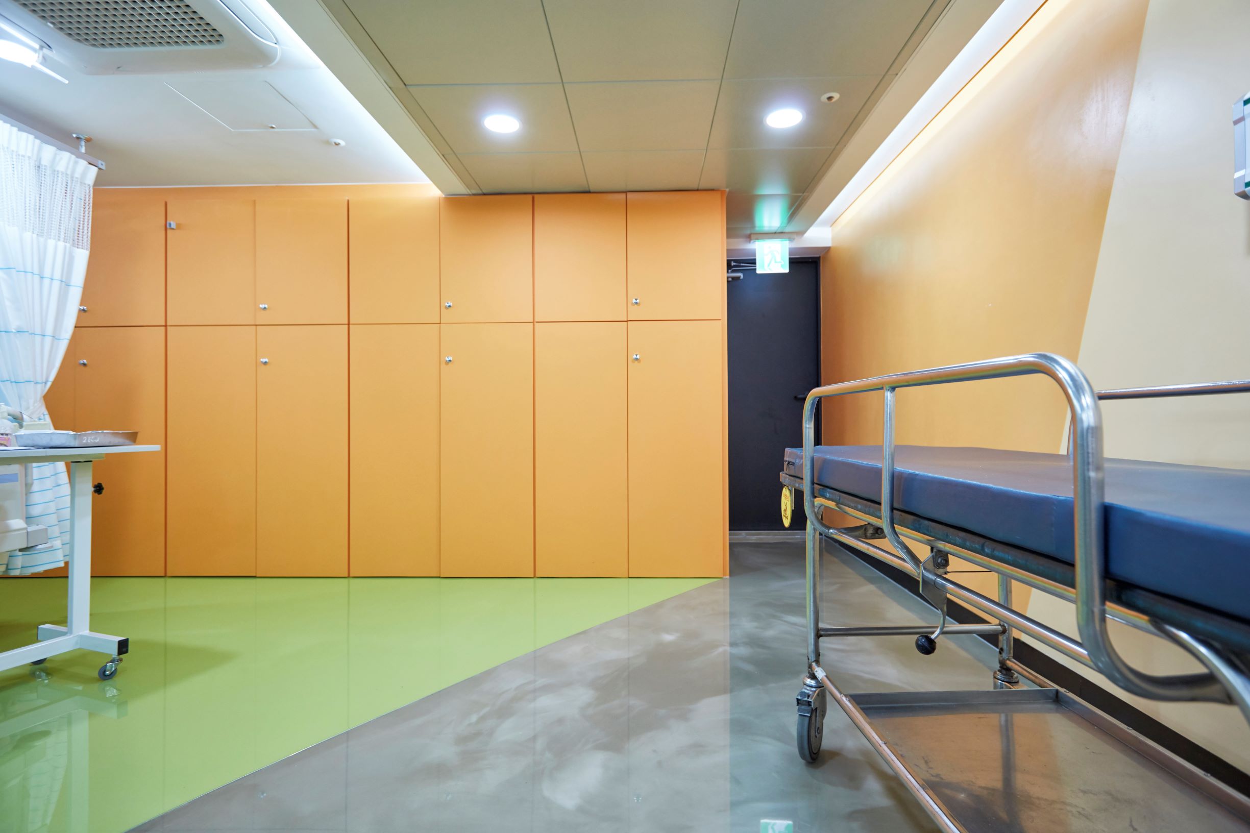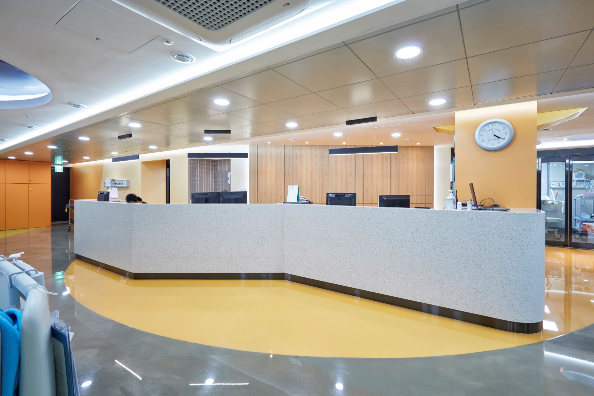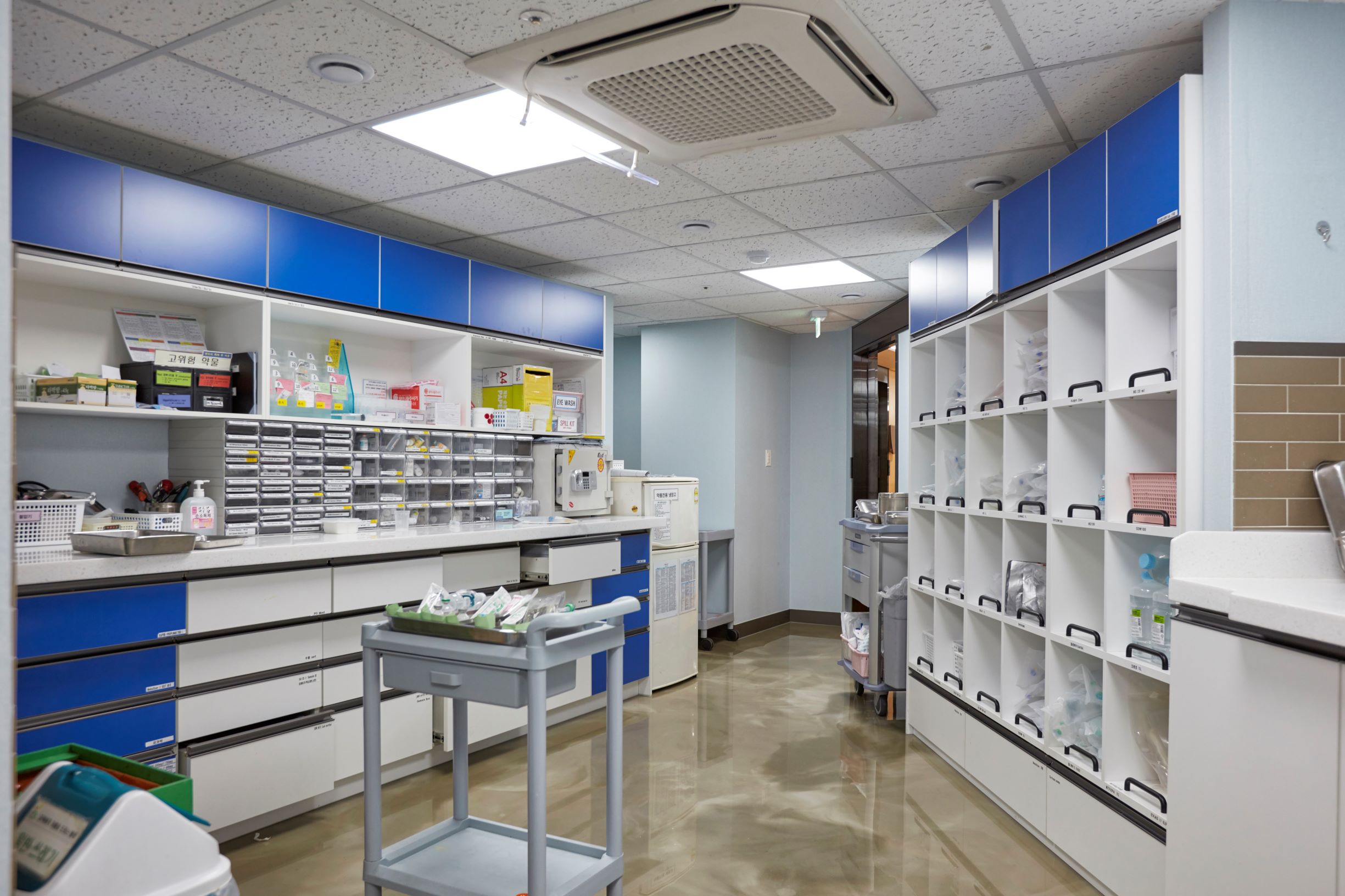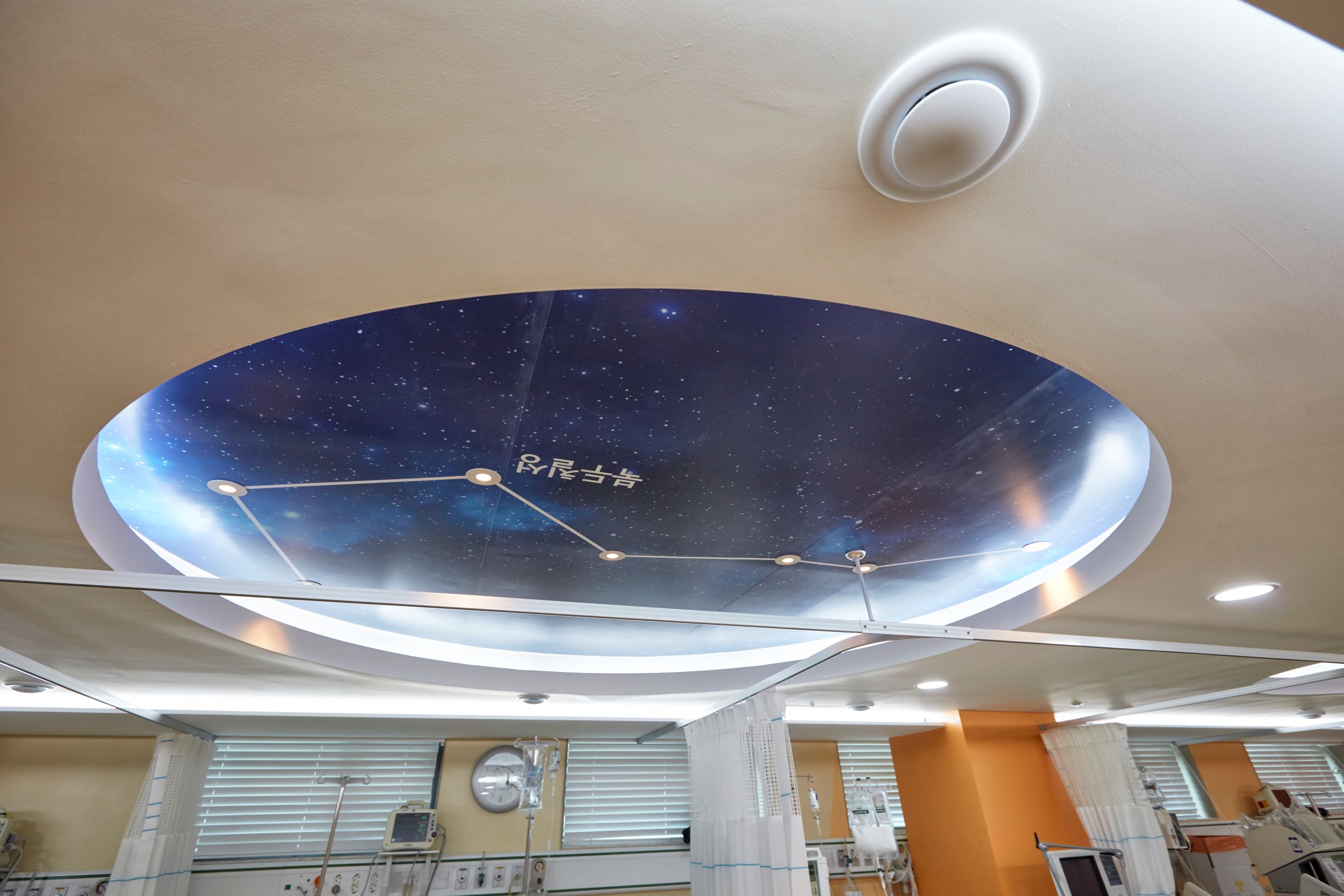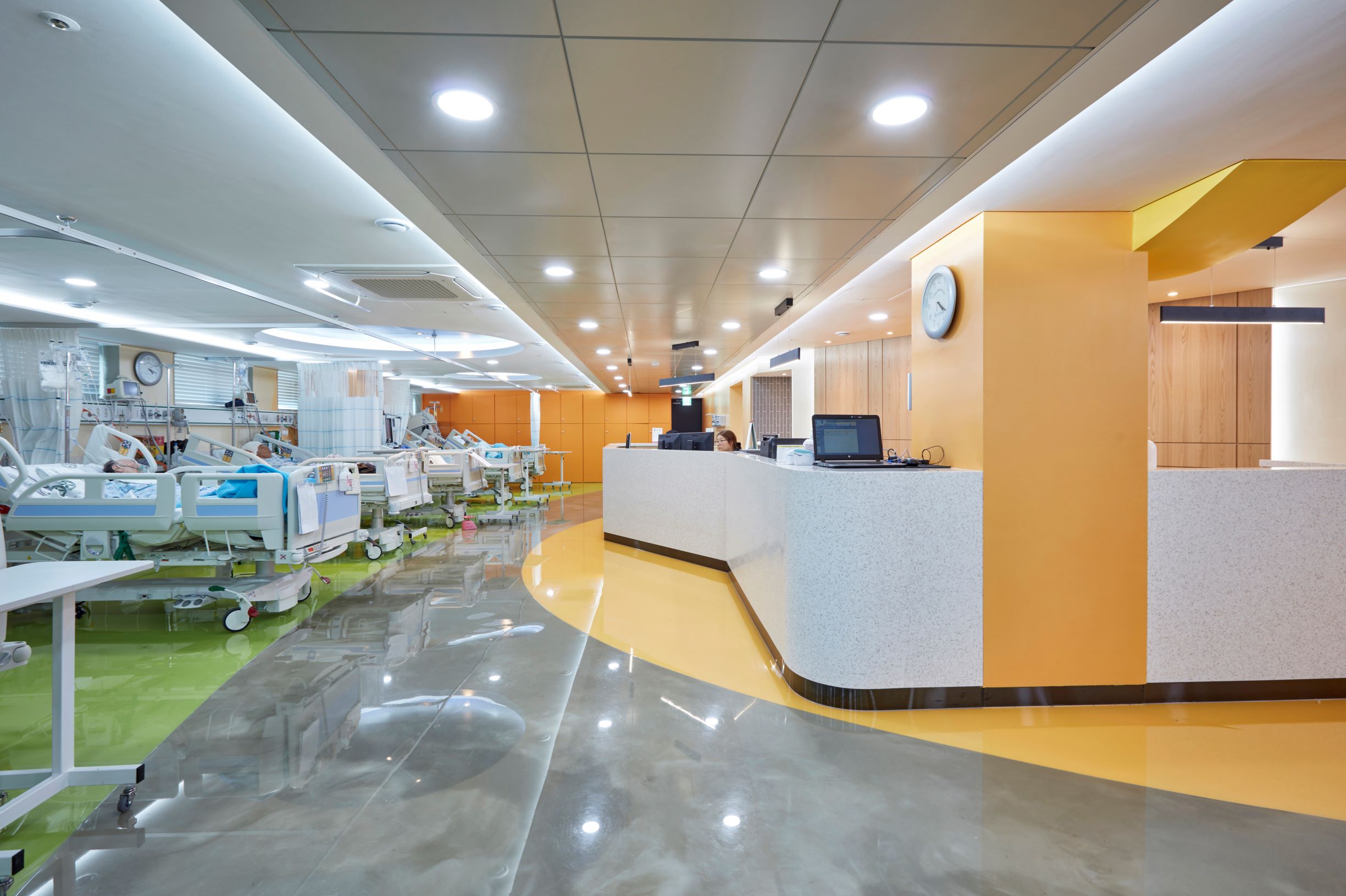 중환자실(intensive care unit)은 말 그대로 상태가 중한 환자가 머무르는 곳입니다. 그래서 병원 내 어떤 공간보다 환자중심 공간이어야 합니다. 의료진이 환자의 상태를 바로 확인하고 피드백이 가능한 기능이 요구되기 때문에 베드와 스테이션의 배치, 등 동선계획이 제대로 구성되어야 합니다. 제주한국병원의 중환자실은 오렌지, 그린, 블루 등 밝고 활기찬 색을 배색했습니다. 상태가 중한 환자는 몸은 물론 심적으로도 많이 지쳐있기 때문에 밝고 활기찬 분위기를 연출하였습니다. 또한 베드에 누워있는 시간이 길기 때문에 실링 디자인에 큰 주안점을 주었습니다. 간접조명에 그치지 않고 밤하늘의 별자리 디자인을 줌으로써 마음의 평안을 얻을 수 있도록 디자인했습니다. 약제실은 약 제조에 오류를 범하지 않도록 가능한 차분하고 정리된 가구로 제작되었습니다.
