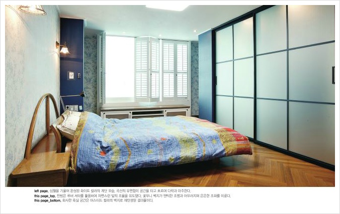 욕실 역시 은은한 감성을 드러내 신비감을 주고 있다. 욕실은 주로 타일로 마감하지만, 한쪽 벽면을 머스터드 컬러의 벽지를 활용하여 화사한 분위기를 연출한다. 이러한 벽지 활용은 기존 욕실에서 찾아볼 수 없는 색다른 즐거움을 주고 있다. 안방에도 이러한 분위기가 이어진다. 블루톤의 꽃 모양 벽지가 한쪽 벽면에 덧입혀지며 공간을 풍성하게 물들였다.