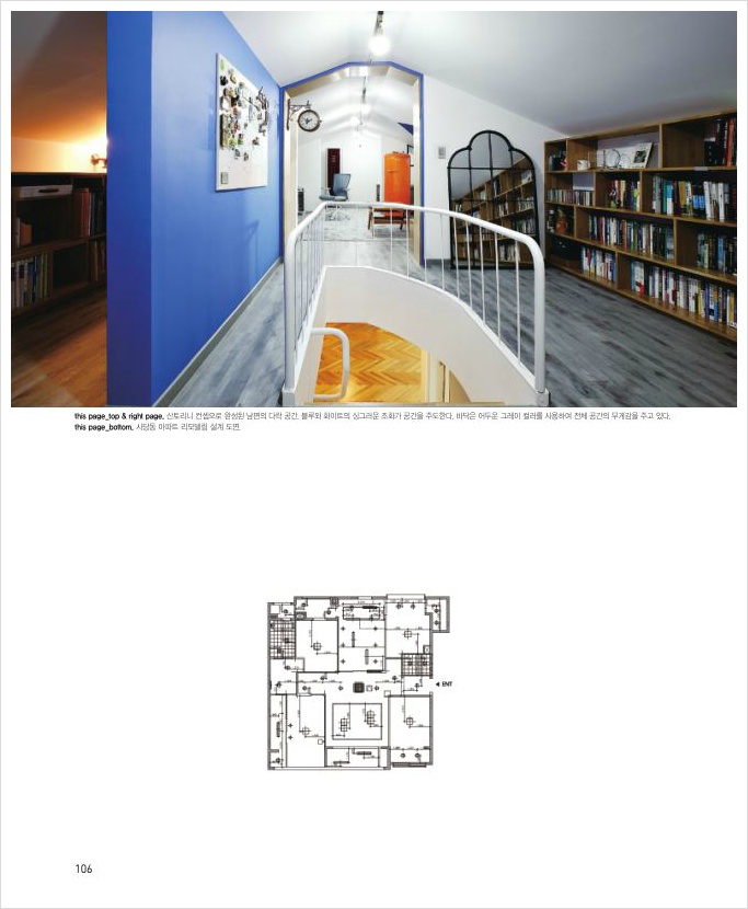 특히 이번 프로젝트의 핵심은 바로 다락의 공간 활용이다. 클라이언트의 남편은 이 다락을 보고 '천공제'라 이름을 지을 정도로 마음에 들어 했다고 한다. 다락이지만 27평의 넓은 평수와 고개을 숙이지 않아도 될 정도로 천장이 높아 그 활용도 면에서 착월함을 드러낸다. 처음 올라서는 계단부터 곡선형의 디자인으로 심혈을 많이 기울인 흔적을 곳곳에 찾아볼 수 있다. 마치 2층에 올라서는 계단처럼 조그만 다락의 계단을 유연한 곡선으로 표현하기란 결코 쉽지 않은 일이다. 크만큼 구조 변경에 있어 시간적인 여유가 충분히 필요하다는 분석이다. 클라이언트는 충분한 시간과 배려를 통해 원활한 진행을 도왔다. 노미경 대표는 바로 이런 배려심으로 다락 공간에 완성미를 더했다고 전한다. 현재 다락은 남편의 서재와 온전한 취미 공간으로 활용되고 있다.