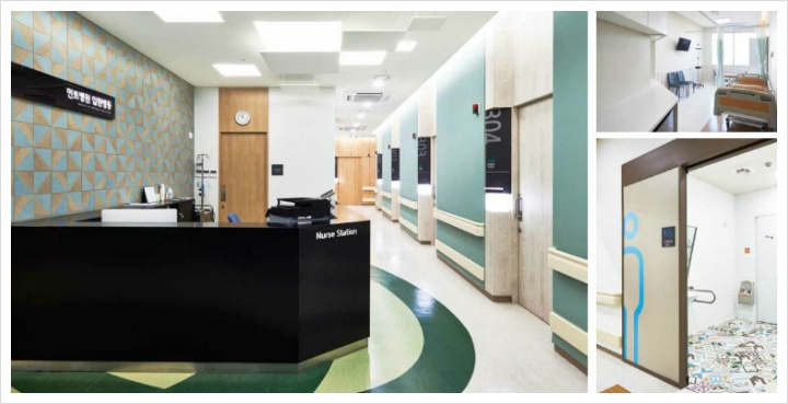 3층에는 입원실과 시술실, 진료 대기 공간 등이 있다. 2층보다는 다소 차분하고 따듯한 분위기로 채워졌다. 민트와 내츄럴 우드톤을 활용한 벽면, 환자의 동선을 고려해 직사각형이 아닌 사다리꼴로 구획된 병실 등 기능과 감성의 조화가 특히 눈에 띈다. 쉽게 접근할 수 있는 휴게 공간과 상담실, 쉽게 눈에 띄는 호수 번호와 문의 개폐 여부를 알 수 있는 조명 등 사소한 듯 사용자를 배려한 디테일이 가득하다. 책상에 앉아서는 절대 나올 수 없는 이런 디테일은 일상의 불편함에 대한 치한 고민의 결과다. 환자와 병원 직원처럼 직접 사용하는 이들만이 알 수 있는 혹은 미처 불편 하다고 생각하지도 못 했던 문제를 해결하는 디자인이야말로 노미경 대 표와 노태린 앤 어소시에이츠의 능력이다. 새롭게 문을 연 민트병원은 상호작용과 소통 을 중요하게 여기는 디자이너의 철학과 환자를 위하는 병원의 철학이 만 들어낸 성공적인 시너지의 결과다.