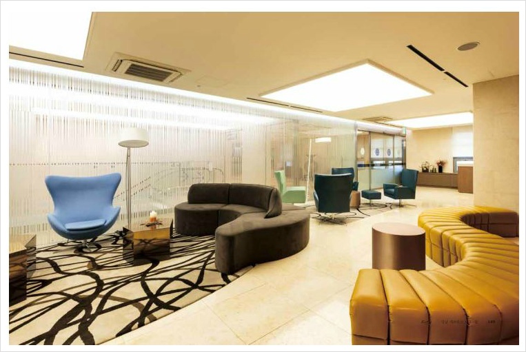 노태린 앤 어소시에이츠는 강남 세브란스 체크-업의 대기 공간을 오직 고객을 위한 공간으로 만들었다. 특별히 집중한 것은 공간을 채우는 가구였다. 고객이 직접 사용하는 의지와 테이블, 조명 등의 가구를 다채롭게 활용해 총 11개의 편안한 대기 공간을 만들었다. 고객이 가장 먼저 만나는 공간인 접수대기공간에는 특별히 S자 모양의 소파와 편안한 질감의 소파, 혼자 앉는 것을 선호하는 고객을 위한 개인용 소파를 사용했다. 상담 시에 사용하는 안락한 스완 체어도 설치했따. 다양한 질감과 형태가 지루하지 않은 공간을 만들고 고객이 편안한 마음으로 공간을 이요할 수 있게 만든다. 주변에 설치된 토마스 헤더윅의 스펀 체어는 공간에 활기를 더하고 사용자에게 웃음과 여유를 만들어 준다.
