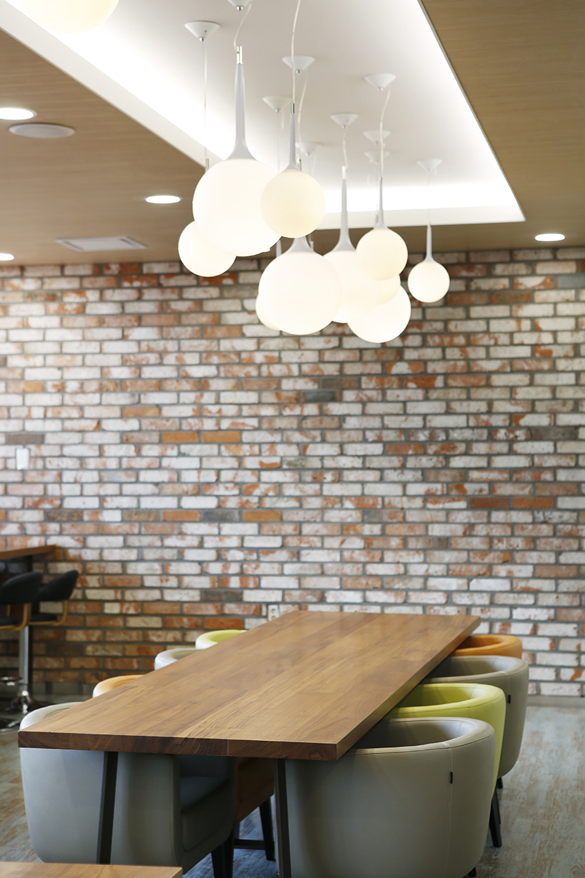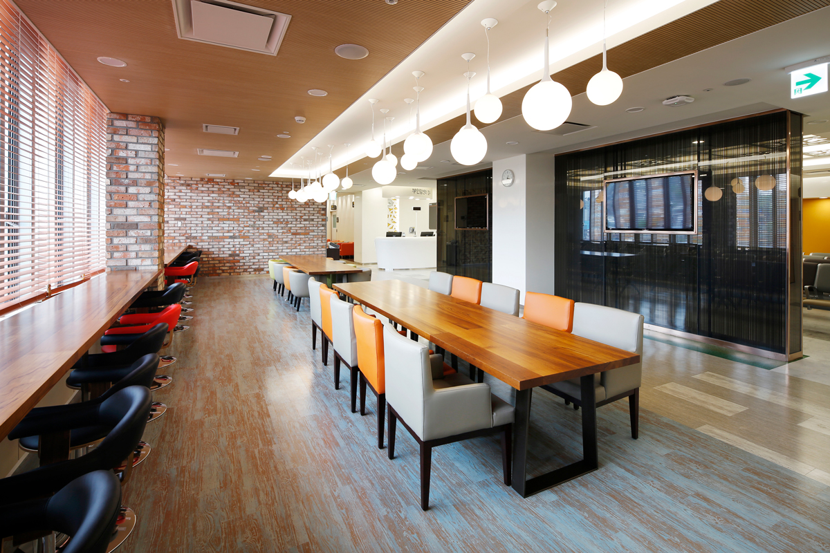 감성적인 디자인을 반영한 가정 친화적 가구가 배치되었습니다. 원목 테이블과 의자가 기본적으로 편안한 분위기를 연출하고 7-10명이 함께 앉아 이야기를 나눌 수 있도록 대형 테이블도 함께 마련하였습니다. 환자와 가족들이 둘러앉아 이야기할 수 있는 소통의 공간이자 환자와 보호자들이 정보를 공유할 수 있도록 한 배려입니다. 물론 혼자서 사용할 수 있는 의자와 협탁도 마련되어 개인적인 공간도 확보했습니다. 또 보다 안락한 의자와 협탁을 비치해 누구나 편히 쉴 수 있는 쉼터로 활용되고 있습니다.