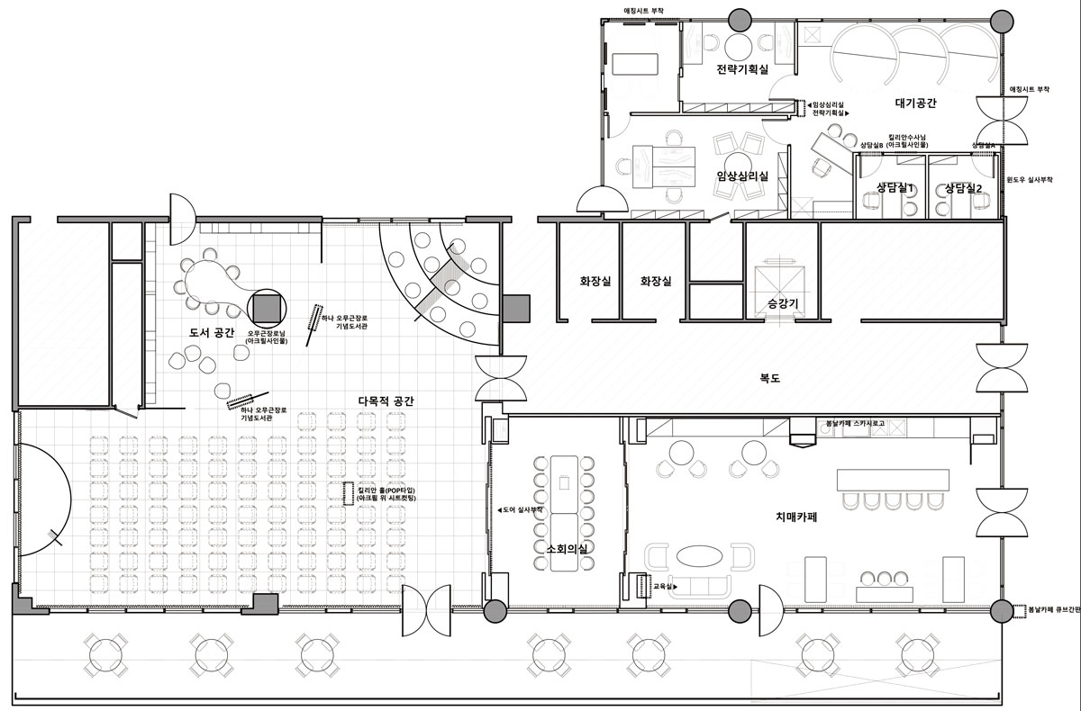 공간은 사는 사람의 모습이 그대로 투영된 첫인상과도 같다. 공간 안에 들어서는 순간 다양한 기분과 생각들이 오고 간다. 여러 가지 컬러와 마감재, 향기, 가구의 배치, 각 실의 위치 등 그 다양성들이 한눈에 펼쳐진다. 그 공간을 처음 느껴본 이들은 당시의 기분 상태를 오래도록 유지하게 되며 머릿속에 각인시킨다. 흔히들 정신과 병동에 가면 두려움과 공포심을 느끼게 된다. 더욱이 TV나 다른 매체를 통해 보이는 정신과 병동의 인상은 어둡고 차가웠다. 하지만 인천 도심에 위치한 참사랑병원은 부정적인 모습과는 거리가 먼 편안하고 밝은 분위기가 맴도는 공간이었다. 클라이언트는 처음 병원 밖에 킬리안 심리상담연구소를 계획하면서 다양한 환자들의 심리상태를 이해하는 공간으로 활용되었으면 하는 바람을 드러냈다. 특히 지역의 소통을 기반으로 치매 환자들을 위한 커뮤니티 카페를 만들어 많이 사람들이 드나들 수 있도록 하기 위함이었다. 디자이너는 이를 위해 환자들이 따뜻하고 편안한 분위기 속에서 지역 주민들과 대화할 수 있는 소통의 공간을 만드는 데 주력했다.