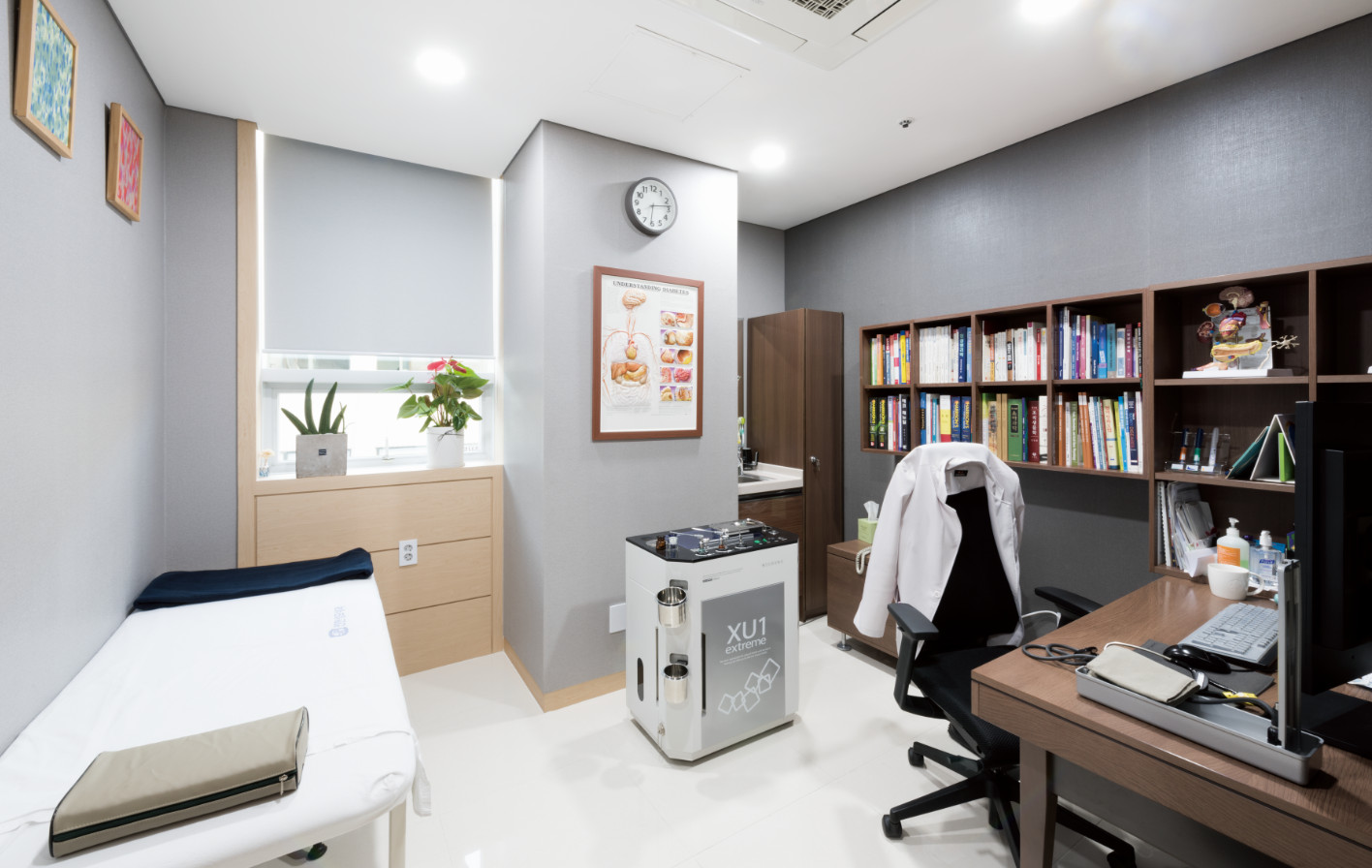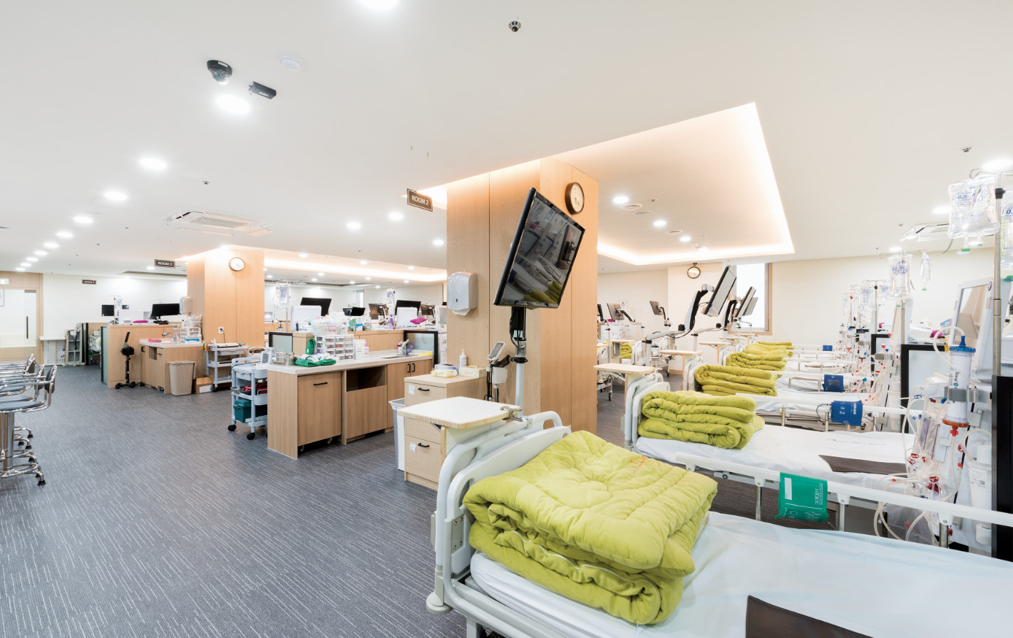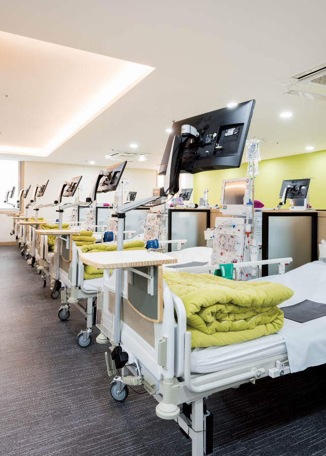 혈액투석이 이루어지는 인공신장실은 많은 베드와 함께 혈액투석 여과기가 공간을 채우고 있다. 자칫 차가워 보일 수 있는 공간은 그린 컬러로 포인트를 준 벽면에 맞춰 베드의 담요 역시 모두 동일한 색으로 두어 아기자기한 분위기를 연출했다. 뿐만 아니라 로비 대기실과 같은 밝은 실내 환경으로 혈액투석실에 대한 불안함을 잠재운다. 내부 한편에는 베드와 평행되도록 데스크를 놓아 실내를 한눈에 두루 살필 수 있다. 환자를 재빨리 도울 수 있는 효율적인 의료 환경을 보여준다.